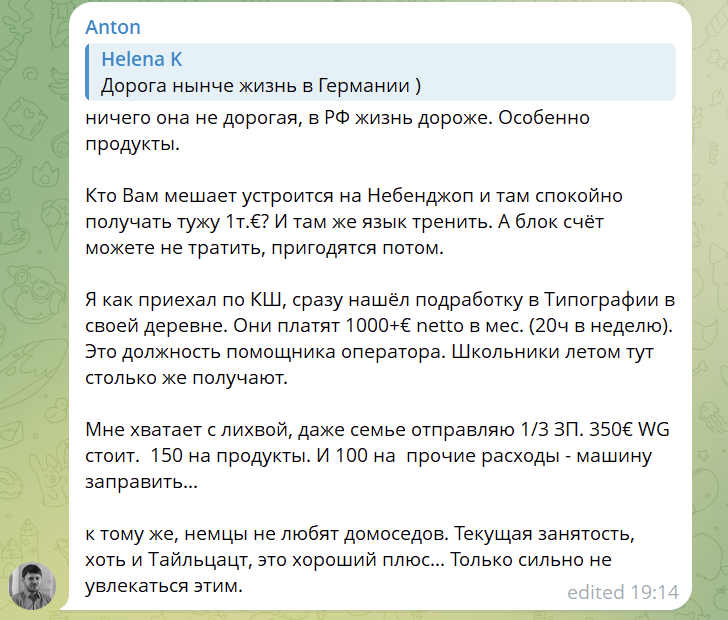 Тред начался с того, что я не понимаю, хули хохланы продолжают оставаться в Польше в более чем заметном количестве, если в Гермахе можно жить как минимум не хуже, только при этом ещё и РАБотать не обязательно. Если ты думаешь, что они тут все хайкволл спецы и получают супер бабло какое-то - так тотоионо что нет, по большей части это дно-работы, всякие мутные схемы трудоустройства чтоб барен мог уходить от налогов (и что не даёт права на ВНЖ, когда временную защиту прикроют), ну и получают они тут соответственно, у многих даже минималки нет. Польской минималки, которая 4700зл, это чуть-чуть больше 1000евро. И не РАБотать они тут тоже не могут, потому что тут по сути никакого социала нет и без работы никто тебе еды не даст и хату не снимет, всё сам как-то. И вот по сравнению с этим чилл на социале в Гермахе, да ещё и с возможностью опционально подрабатывать в черную - это норм такой левелап для них был бы.