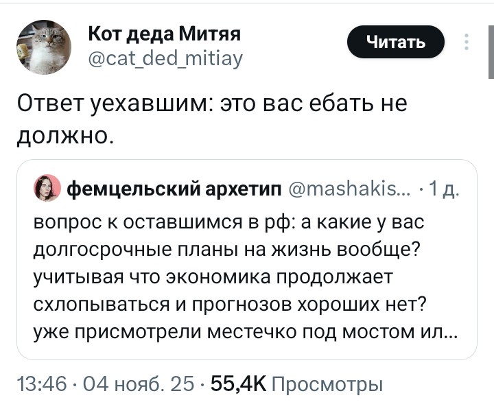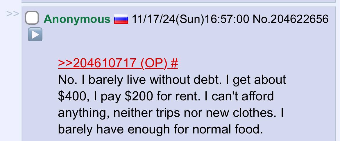 Шёл 4ый год войны. Их обирали до нитки НДСом и заёбывали походами за уточнением данных в военкоматы. Они тряслись перед неопределенностью будущего. Что будет с экономикой и рублем через 2-3 года ? Ведь уже сейчас нереально позволить себе машину, квартиру, а скоро уже будет не купить и нормально бытовой техники. А надвигающаяся мобилизация? Ведь если все это продолжится, то резервисты и готовые идти за деньги неминуемо закончатся.