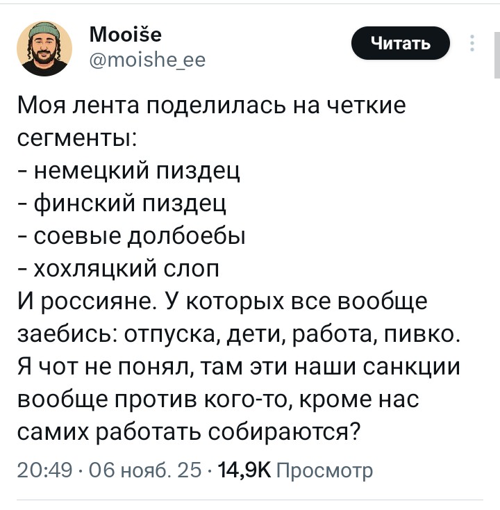 Добрый день. Там некоторые диванные эксперты с подачи Соловья кукарекают, мол после взятия Покровска, П. в качестве жеста доброй воли скажет, что готов к переговорам и мы прекращаем дальнейшие действия. Далее на прямой линии в декабре скажет, что все задачи выполнены, донбас освобожден, помянет павших минутой молчания и объявит, что он (пыня) уходит с поста. Его место занимает патрушев младший, которого в ноябре назначат вместо мишустина. Далее мол пойдут реформы и дружба с западом.