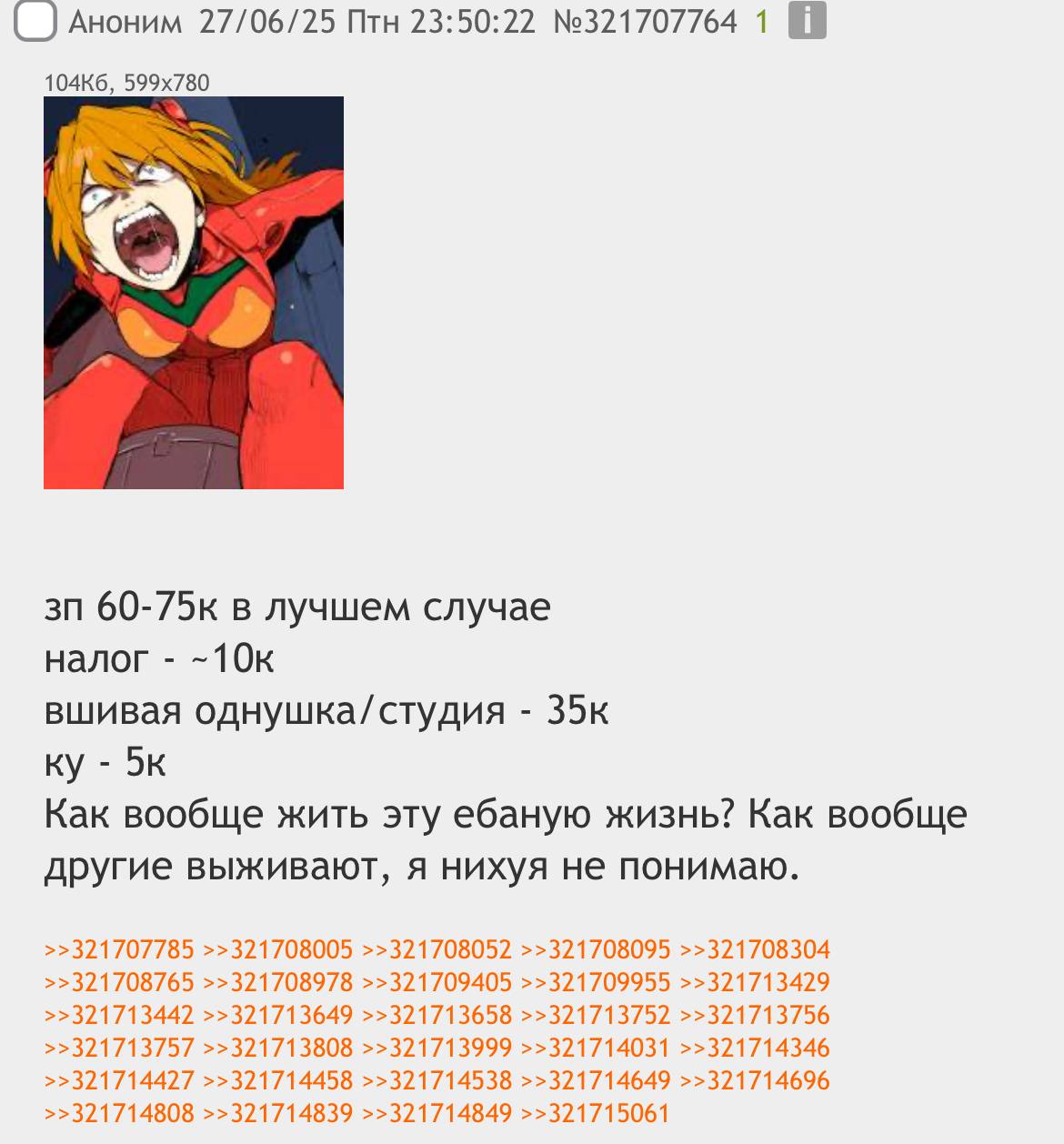 >>1254012 → Речь про вкат в айти. Вкат в принципе сечйас сложен а чтобы сразу на удалёнку это видимо вообще околофантастика. Ну а вкат где-то кроме москвы это пиздец просто. Для сравнения у меня два предложения (оба в айти): - В Тбилиси 4 месяца работать бесплатно (серьёзно) чтобы потом получать 1000 лари/мес (~30к рублей, да, в месяц!!!! не в неделю) - В Москве 150к/мес с заходу Ну вот и думаю нахуй. Ещё вакансии брутфоршу, ну там ещё выпал вариант +- приличный но тоже требуют в офисе сидеть в России, тоже с перспективой перехода на удалёнку но нет сука в офисе ты должен просидеть годик. Сука, а что за этот годик будет вы не думали??? Ладно б там ещё на неделю съездить, хуй бы с вами, вероятность какого-то ПОЧАЛОСЯ в течении недели мала. Но в течении года?? Что вообще за ебучий фетиш на то что вкатун должен обязательно сидеть в вашем ебучем офисе