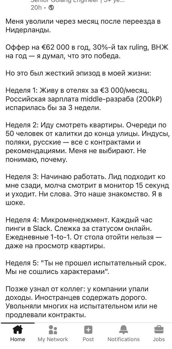 Да, такое бывает, но редко, и ну да это сразу гг вп чемодан и домой. Я был готов к этому когда переезжал, но я все успел. Был готов к этому, когда понял, что стартап, где я рабоотаю, дышит на ладан, но я начал искать работу заблаговременно, и удачно получил оффер в ту же неделю, в которую нас лейоффнули. Товарищ поступил примерно так же, но начал искать позже, и получил оффер позже. Но он хотел больше денег и пошел контрактором, а у него в это время была несчастная любовь и он постоянно ебланил, в итоге его выгнали через несколько месяцев за андерперформанс. Короче ничего удивительного и не показательно, ни история челика с линкедина, ни моя.