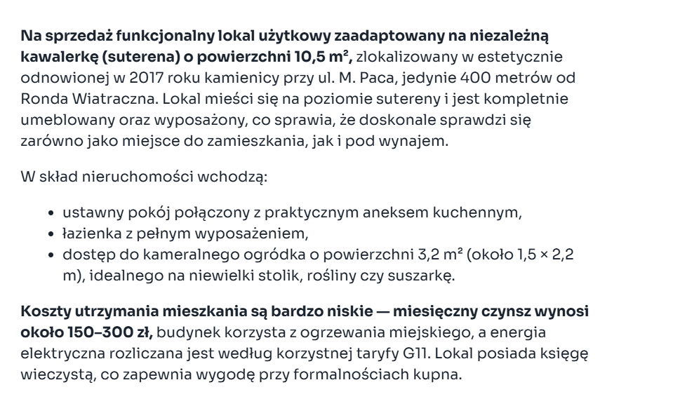 Вот цена в Кракове за 40м в новострое под сдачу в средне-неплохом стандарте. По крайней мере такая цена для ойтидебилов, которые не могут в / не имеют времени на ремонт и коммуникацию и платят за риэлтора, надзор и прочие "услуги", а скорее всего только так люди из этого треда и смогут.