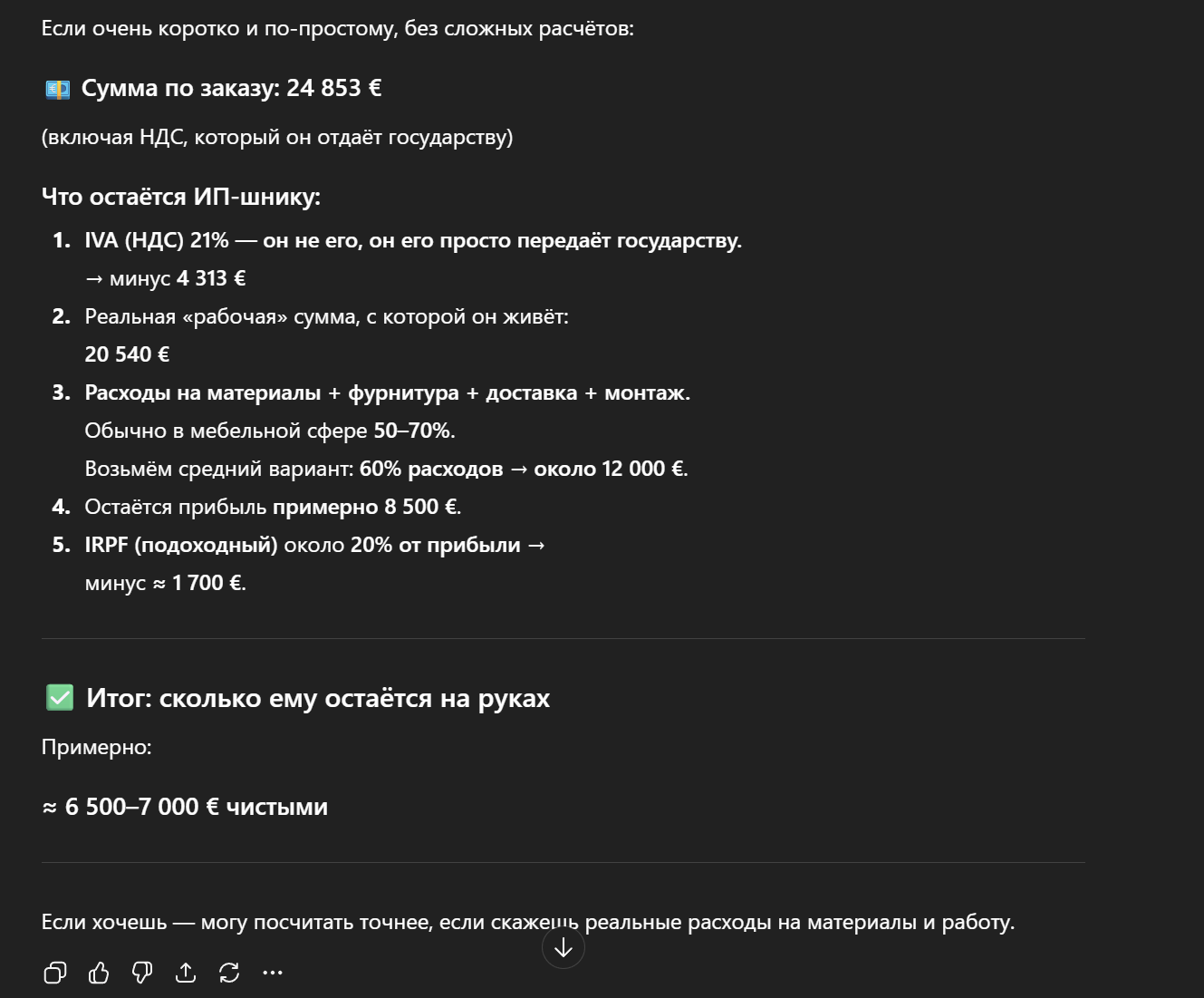 >>1259522 Тоесть ну допустим это это я свинья ебаная и мне надо ЖРАТЬ. Ну допустим средний завтрак 15 евро и обед 20 евро. 25 рабочих дней условно. Это 875 евро только на ПОЖРАТЬ. И это МИНИМУМ. А еще надо ужинать там дома. Тоесть средний Хуан получает 2к. Из них на ВНИМАНИЕ КОМНАТУ он тратит 600. Я хз как посчитать однушку потому что в барсе она будет 1300 стоить в аренду. Соотсветственно это КОМНАТА. После налога от 2к останется где то 1600. Оттуда - комната 600. Ну вот и остается тыща трусы там купить, и покушать в кафешке. Это просто пизда. Ебаные нищие ахуеть. КОМНАТА, Карл. Бля даже если он будет 3 к получать ну максимум это исправит ситуацию с комнаты на однушку обосратую. А вне Мадрида Барселоны для среднего испанца и работы особо нет. Пиздец конечно.