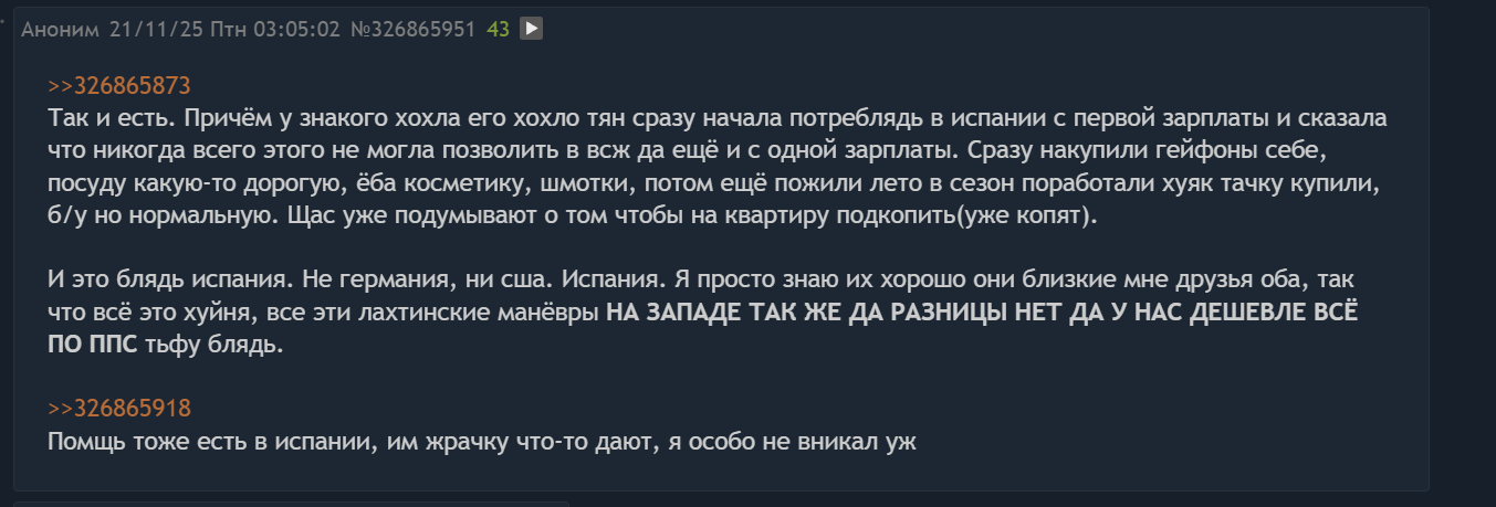 >>1258662 Я не понял, надо оправдаться за черногорию чи шо? Ну по делу я считаю что черногория хуевая страна как и сербия. Что там всех будут сливать и максимум который можно будет там вытянуть то это пмж в сербии, но не паспорт. Да и нахуй он нужен. Это было понятно и раньше. Я бы не стал жить в этих странах и лучше бы жил в россии если уж выбирать. По делу я не верю что людей имеющих легальные основания на проживание в испании а уж тем более с пмж или гражданством кинут через хуй в том числе с квартирами. По делу я считаю что ЭТО ДРУГОЕ. И таким образом иду на сознателный риск. Я верю в то что людям будут вставлять палки в колеса в прибалтике, но не верю что испания пойдет на что либо подобное. Я скорее верю что меня трахнет экономическая ситуация чем испания. Как я уже и говорил одной из причин выбора этой страны было в том числе ее либеральное отношение к перекатышам. Тут все еще можно нелегально отсидеть два года и получить на этой почве внж. Я не знаю где еще такое возможно. Хотя в нашем ебанутом мире ни в чем нельзя быть уверенным. Именно поэтому я пишу про риск а не про то что ЭТОГО НЕ МОЖЕТ БЫТЬ. Там вон инопланетяне к нам летят, и вв3 на пороге. Какие тут гарантии. Я думаю что аквафрешам очень хочется преисполниться в сделанном ими выборе и они экстраполируют логику шиткхоулов на другие нормальные страны чтобы в очередной раз показать что лучше россии страны нет для русского человека и что жить в россии это единственный правильный выбор.
