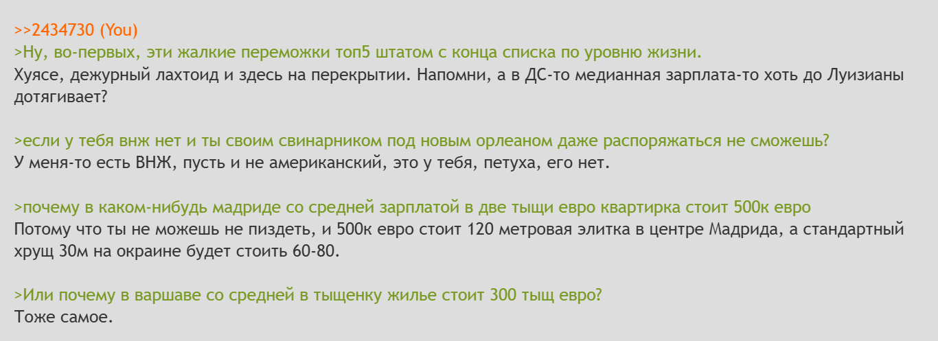 >>1260511 → >>1260510 → Отвечаю на этот ответ. Вы щас опять скажете какой я долбоеб и все такое. Ну первое я пиздец как наездился и даже сама мысль о переезде после стольких усилий со справками на справки вгоняет в ужас. Идея о том что надо ехать обратно с кошкой, со всеми пожитками. У тети Оли которя ненавидит переезды вообще кукушка нахуй отлетит. Да и у меня тоже. Как будто пройдено слишком много чтобы бросать. Уж лучше тут полочки прикручивать. Во вторых ну бля я в целом не хочу жить в питере на намыве. Не знаю где хочу в россии как будто только юг остается, но этот питер я рот его ебал. Намыв в частности с его вечной стройкой. Каждую зиму и осень я ждал момента чтобы оттуда сьебаться в тайланд. А возвращаясь унывал потому что еще три месяца терпеть пока лето придет. В третьих ну вот тут как будто жилищный вопрос проще закрыть. Я не хочу в рахе в еботеку влазить. Даже две третьих хаты оплатив я получу хуйню где жить то особо и не по кайфу будет с платежами еще по 200 к в месяц. Да нахуй надо. Уж лучше тут коробку взять под 2%. Мне в целом тут нравится природа, климат и нахождение вне дома тут мне приносит удовольствие. Вот все эти поездки на велики, шабление, сидение накуренным у моря. И это я еще тачку не купил. Океан, возможность там летом поехать в той же испании на моря это заебись. А в питере нормальной погоды 3 месяца в году и то с оговорками. По работе даже если они там чето подпишут со мной один хуй с рахи работать не будут по остаточному принципу. Щас доджат работу с русами и хохлами. У первых из за токсичности у вторых головняк с бусификацией работников и выключениями света. Проще и не связываться. Не то чтобы тут как то дохуя возможностей, но вернувшись в раху светит мне работа только на аутсорс галеры в рашке за бомжовый прайс. Но там и расходы ниже надо сказать. В пизду кароче. Я вообще хочу выкатиться нахуй с этого аутсорса и работать в девелопменте, а из россии это делать не получится. Ну и последнее. Мне не нравится идея вот этого "русского поля экспериментов". Это я успел хотя бы на жизнь какую то заработать, на халупу и опять сбрили жир. Каждые 5 лет новая хуйня. Новый кризис. Постоянно какие то социальные лифты в виде анальничества и вебкама выстреливают. То надо быть военным чтобы подняться, то комерсом, то юристом все шли, то блят экономистом. Мать у меня в совке на товароведа училась по настоянию родителей чтобы домой колбасу таскать с работы, а все в семье военные были потому что там пайка увеличенная и квартиры. Меня это заебало. Я просто хочу уже дожить жизнь без всей этой хуйни и многоходовочек. Но я уверен что я такой бедовый лох что попаду на экономический спад в европе и потом буду сидеть с себя проигрывать когда вот эта хуйня и ей подобные >>1260719 начнут европедирасиков ебать. И когда я буду ссылаться что в далеком 2010 году было в европе сыто и богато и я туда поехал потому что мне варламов мозги промыл то мне в 2040 будут говорить НЕ НУ ТО ВРЕМЯ ДРУГОЕ БЫЛО ПЫНИМАТЬ НАДО. А ебано будет везде. Просто этот разрыв между рахой и условной испанией сократится еще больше. И там и там на пенсию хуй пососешь или до нее не доживешь просто. И там и там работать до седых мудей. А выиграют те кто сейчас тут в испании доживают и на свою пенсию сидят вино пьют и отлетают в вальгалу доедая самую лучшую в европе медицину и прочую социалку. На счет договорняка. Я в него не 