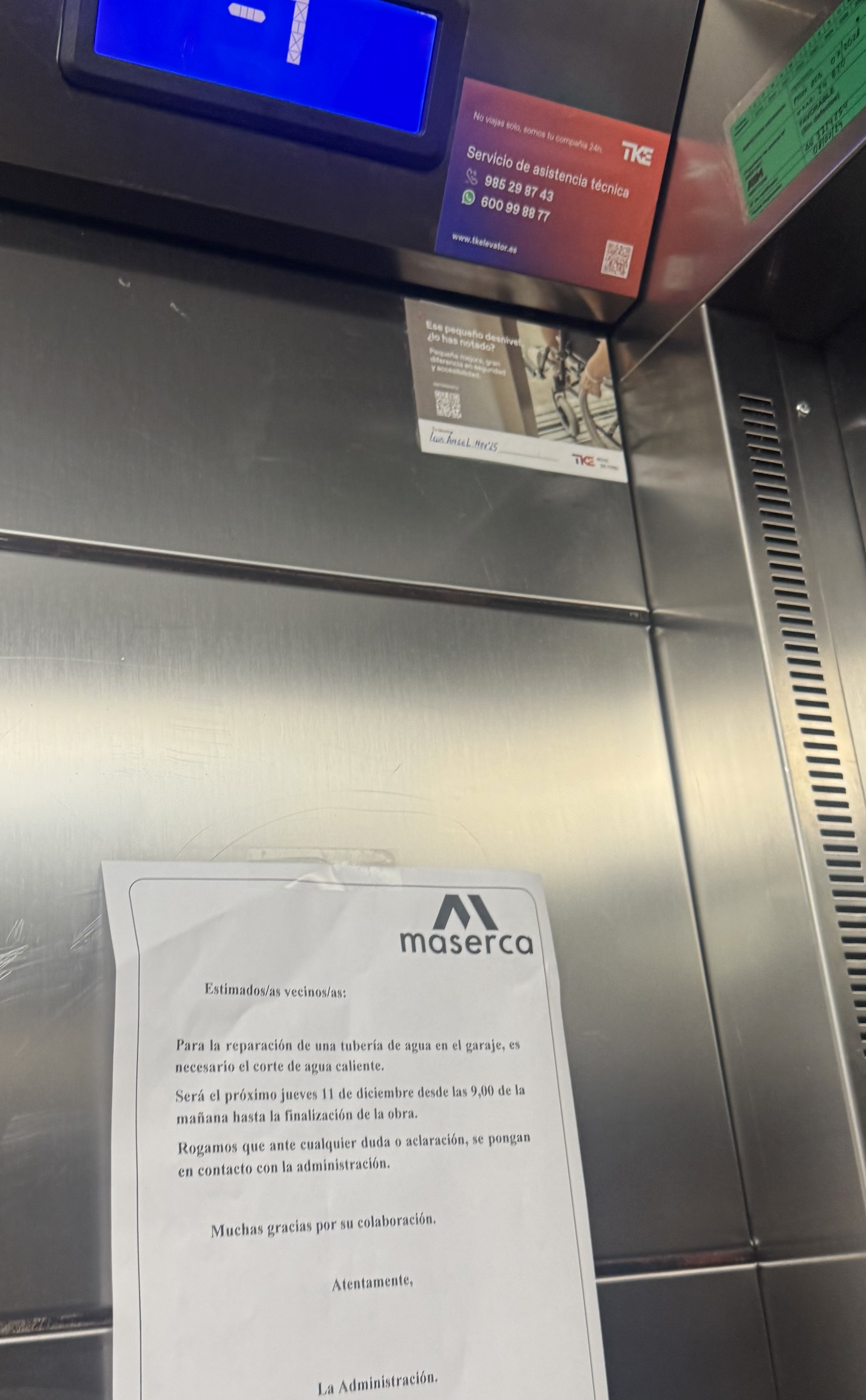 Стою в этом лифте и понимаю Намыва, смотря на бумажку про “corte de agua caliente”, чуйствую пробуждение вовнутрчх визгливого монолога о том, как эти вшивые европейцы умудряются превращать каждую бытовую мелочь в маленькую драму континентального масштаба: то воду отключим, то лифт застрянет, то ремонт начнётся “hasta la finalización de la obra”, то есть, переводя на человеческий, — никогда. И всё это под видом цивилизованного комфорта, где каждая бумажка — как мемориальная табличка о том, что жить здесь надо с осторожностью и терпением, потому что иначе ты просто сойдёшь с ума от их великих инженерных подвигов и ожидания, что станет, как надо.