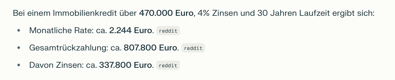 >>1268832 Ты сравниваешь платежи по ипотеке и аренде так, как если бы они были равны. Это не так. Там, где ты будешь платить за аренду трёшки в хорошем районе крупного города (не берём Мюнхен там совсем шиза) примерно 1500, за такую же квартиру по ипотеке будешь отдавать 2000, если не больше. Плюс сейчас такой момент, когда и процент по ипотеке и цены на недвижеу высокие. Условная трёшка 70кв.м в Штутгарте будет стоить не меньше 600к при, в лучшем случае, процентах 4х в год. Тут каббала ипотечная уже не выглядит так привлекательно.