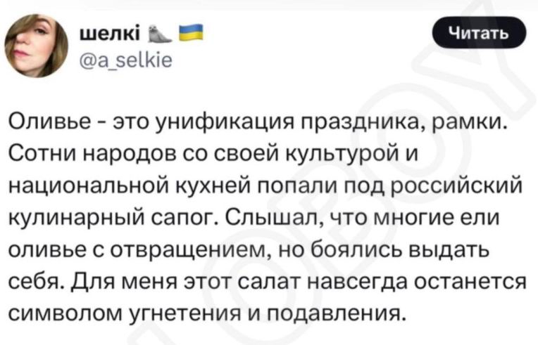 >>1267041 Ну вот не надо, я люблю оливье. В детстве только дико брезговала майонезом. Привело это в итоге к тому, что мама прогнулась и начала для меня отдельно делать оливье без майонеза. Потом я научилась его готовить сама и готовила круглый год. А потом у меня заржавела краяльница, которой я картошку и яйца на кубики нарезала, а ножом слишком запарно, и чёт сдулась. А потом постепенно похер стало на еду, жру и с маянезиком этим вашим уже.