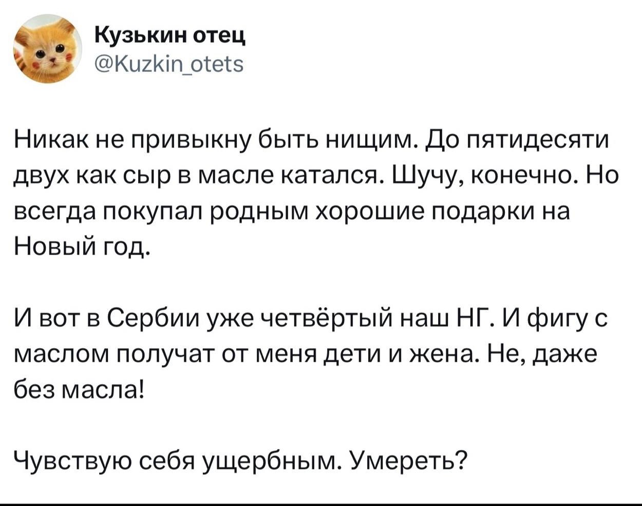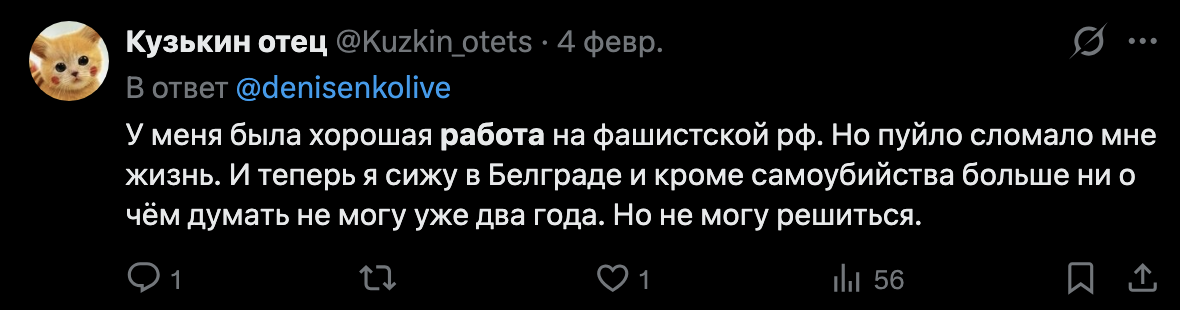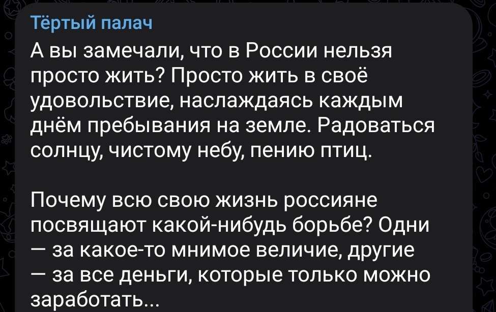 >>1267599 Объективно многие почти все сюда приехали из-за гойды. В каком-то смысле мы реально дезертиры - не пошли в окоп дроны ебалом ловить, а убежали из страны, роняя кал. Плохо это? Стыдно? Лично я так не считаю. Я сижу с двумя ногами и двумя руками в квартирке и капчую на удаленной работе, сытый и в тепле. А те, кто пошел в 2022 году гойдироваться, уже сдохли либо инвалиды колясочники. При этом какого-то особого почета и уважения к ним нет, таких людей в обществе на всех уровнях воспринимают как расходный материал и не более. Все, кто пошел на гойду, в какой-то момент наверняка пожалели об этом. И те, кто сидит в окопах сейчас, наверняка готовы отдать все, лишь бы сбежать с фронта и на самолете до Белграда съебаться при первой возможности.