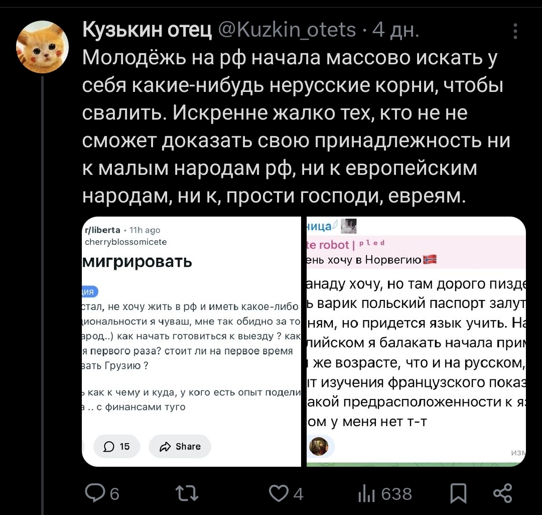 >>1267518 > а просто поехавший местечковый дед, Да заебал ты со своим врёти. Этот дед стопудов бухает с теми русами которые живут здесь давно и он от них узнал как нас называть если мы все приехали такой толпой или чем мы отличаемся от русов прошлой волны. Да, я лично общался с дедом из Москвы который сюда на войну приехал и жена у него хорватка и он с ней познакомился когда в Хорватии воевал в начале 90х. Ты прост бомбишь лишнего кароч. В целом не то чтобы они не имеют права так говорить или называть, но если не хочешь воевать, то значит ты дезертир и похуй вообще. Это ничего плохого не означает.