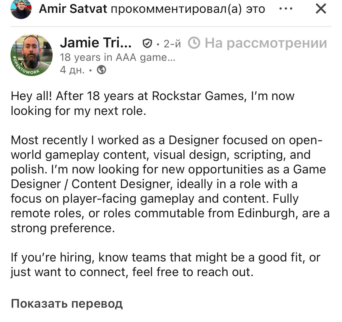 Щас еще блять похохочите со мной с рынка труда и ЕВРОПЕЙСКИХ ВОЗМОЖНОСТЕЙ. Как я ахуенно пососу хуяку с наймом. Блять это хорошо у меня еще батрачка есть основная. Щас начались поиски новой и это просто пизда. Просто нахуй это даже не красный океан а бордовый. Какая то конкуренция с челами с 20 лет опыта из юбисофтов которых пидарнули на мороз и всем надо куда то устортиться а 99% вакансий это офис куда аплаишься для статистики и тебе присылают в лучшем случае отказ. Приклейтед из переписки с челом с райота. Интересно какая будет конверсия с 200 аплаев.