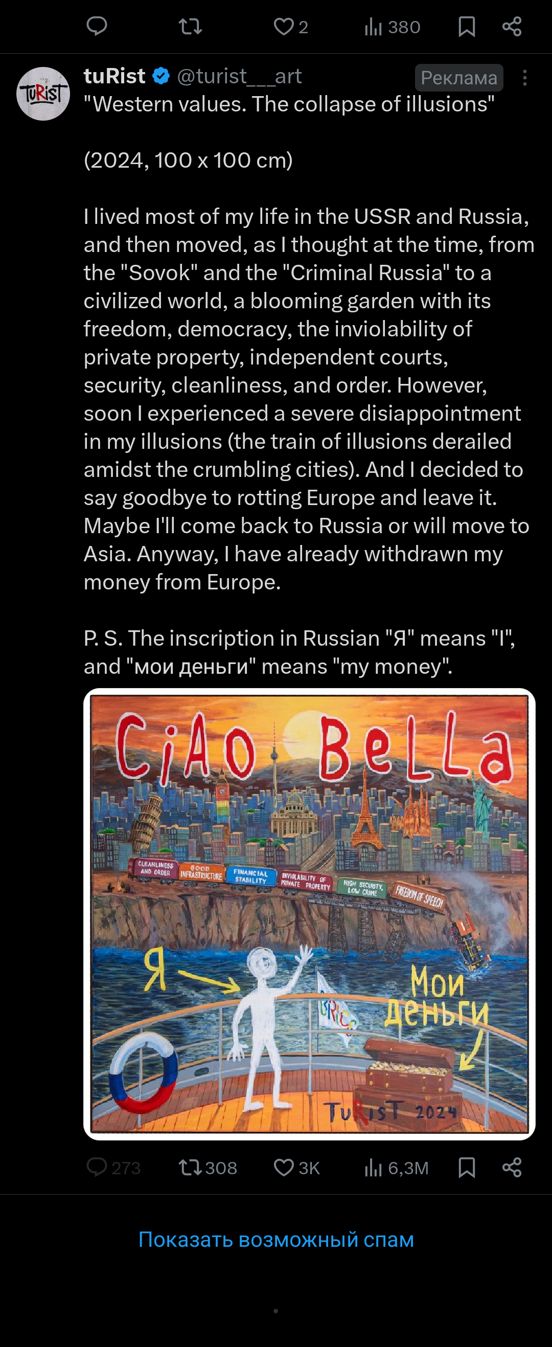 Вот так тоже иногда почитаешь эти сопли и жить не хочется, и хочется обратно в фазерлянд/ на намыв. Потом иду общаться с умным гугловским ботом про то как всё неоднозначно, я ему намывовские наративы про отсуствие отопления в домах йобку с налогами, маньяну, обдрыстаные крокеты на погрызенных тарелках в барах прореженных дедами. Он мне факты про испашкопаспорт и свободу перемещения. И даже как то легче становится...
