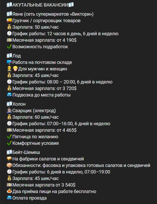 >>1278199 Я не знаю Так то зарплаты что написаны они настоящие Например 50 шекелей в час по 12 часов в день , 4 недели в месяц Теперь посчитай что после 8 часов идёт надбавка 50 процентов вроде, то есть у тебя выходит 700 шекелей в день, плюс за пятницу или шабат тоже надбавка, короче выйдет около 20к шекелей, что после налогов выйдет 13 например Но ты будешь прям рвать жопу 6 дней в неделю по 12 часов? Пиздец какой то Алсо где заработок помогайки?
