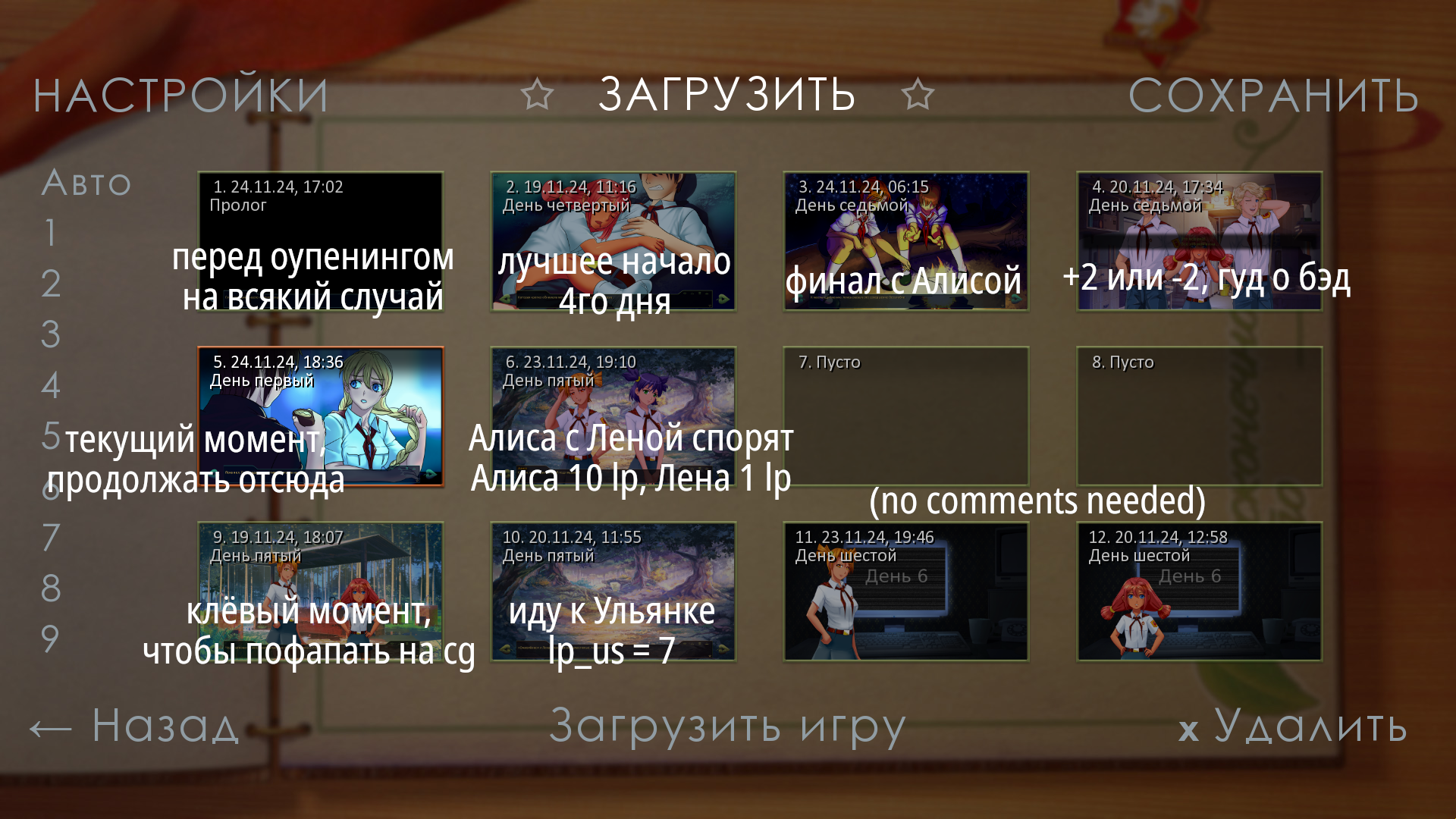 Фигасе вы прошаренные. Я тупо все сохраняю на первый слот :D Остальные слоты забиты не пойми чем со времён первого прохождения. Проще проскипать сначала до нужного момента, заодно может остановиться на каком то интересном моменте и заново прочитать его.