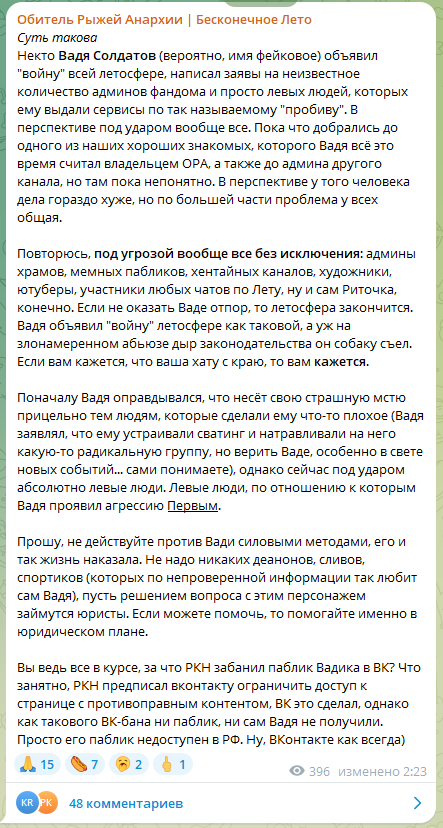 >>1255846 Город палить не буду, но если тебе очень нужно, то сам найдёшь. А если ты имеешь в виду виртуальное место, то... Ну, как бы сказать. Его паблик, посвящённый багьбе с летосферой, недоступен на территории РФ. За постинг ЦП. Да, у персонажа, который получил по шапке от РКН за цопу, хватило наглости и тупости накатать на кого-то заяву.