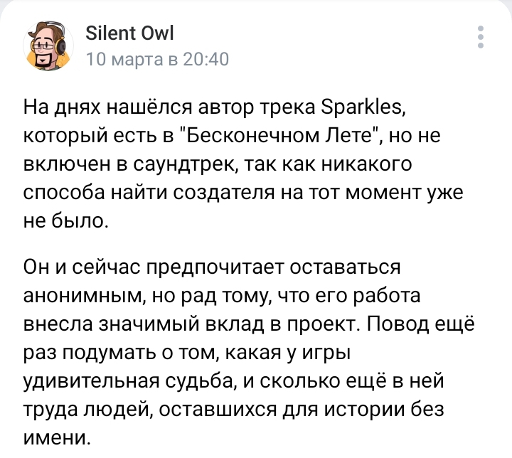 Заключение Эта версия "Бесконечного Лета" с элементами тёмного фэнтези, восточной философии и языческого мировоззрения предлагает глубокую и мрачную историю, наполненную философскими размышлениями и моральными испытаниями. Мир "Совёнка" становится местом, где каждый выбор имеет цену, а каждое действие ведёт к новым последствиям. Пионерам предстоит пройти через мрак и ужасы, чтобы обрести понимание и гармонию, принимая тьму как неотъемлемую часть своей сущности.