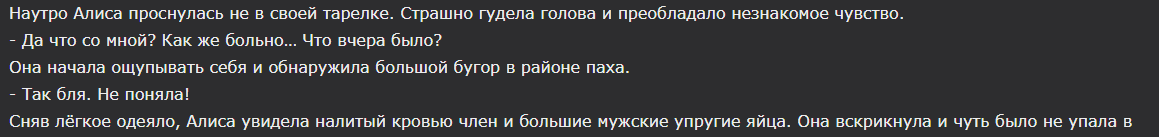 >>1151375 Фанфик с реально круто описанными сценами секаса Алисы и Слави и весьма убедительными подводкам к ним. Ближе к концу повествование начинает сильно страдать, но первые 2\3 там были достаточно мощные.