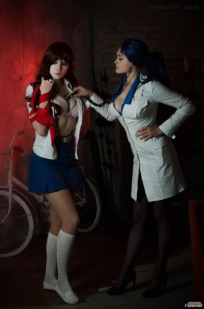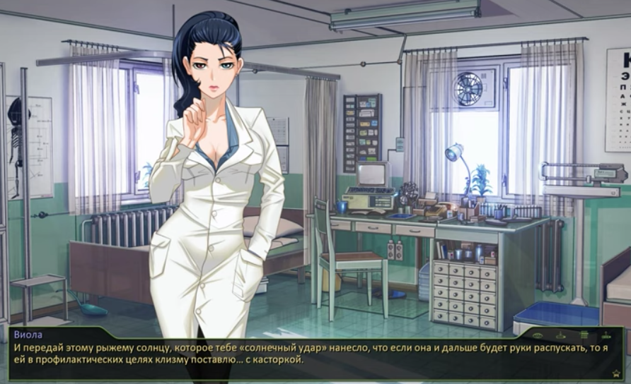 Убегать Алисе было всё равно некуда, да и шлёпки после падения в кабинете разлетелись не пойми куда – один валялся у самой двери, а второго шлёпка было не видать. Да и Виола наверняка настучит тогда ОД и ей ещё сильнее достанется. Под грузом этих мыслей Алиса обречённо постанывала пока виола водила ей ваткой по коленкам. - Виол.. ла.. можно пожалуйста никому это не рассказывать.. ну всё это – краснеть Алисе уже было больше некуда, кажется она вот-вот превратится в огненную комету. - Вообще-то я обязана написать докладную твоей вожатой, ведь ходить.. совсем без формы в лагере не положено – Виола придвинула стул прямо к кушетке с Алисой и уселась перед ней, закинув ногу на ногу – Но если ты пришла сюда на полный осмотр и профилактические процедуры, то можно обойтись и без бумагомарательства и лишней огласки.. – на словах про осмотр и процедуры медсестра сделала особый акцент растягивая гласные, но не единый мускул её лица в этот момент не дрогнул. Чего не скажешь о Дваче, у которой на лице всё ещё застыло выражение смятения, стыда и испуга, она всё ещё смотрела себе на груди, не решаясь поднять взгляд. Не дождавшись ответа, Виола аккуратным, но достаточно уверенным движением подняла голову Алисы двумя пальцами за подбородок. Двачевская опять вздрогнула, но на этот раз от прикосновения прохладной резиновой перчатки. Виола принялась заглядывать Двачевской в зрачки, в рот, попросила дыхнуть. Удовлетворённая результатом этих манипуляций медсестра немного отстранилась и потянулась за стетоскопом, который лежал на столе. Наконец-то Дваче смогла нормально рассмотреть свою пленительницу в холодных лучах люминесцентных ламп медпункта. А смотреть было на что, медсестра сегодня оделась не только в свой классический медицинский халат, который так удачно подчёркивал достоинства её фигуры, а заканчивался он ровно там, где начинались капроновые чулки, так удачно подчёркивающие захватывающие изгибы скрещенных друг на друге ног Виолы. Ну и конечно же туфли на высоких каблуках – «Она так к дискотеке готовится или всегда так одевается?» - пронеслось в голове у Двачевской. С ног медсестры взгляд Алисы закономерно перескочил чуть выше на задравшийся подол халата. Уловив направление взгляда своей визави, Виола неспешно перекинула одну ногу на другую. Алиса готова была поклясться, что в тот краткий миг, когда свет упал Виоле под халат, то она не увидела нижнего белья под колготами медсестры. Хотя возможно ей просто показалось и это была причудливой игрой светотеней. - Ну и куда это мы уставились? – ехидно поинтересовалась Виола. - Я.. согласна! – с нажимом выдавила из себя Алиса чтобы сменить тему. - Ох, Рыжик.. в следующий раз когда тебе захочется ещё погулять без одежды, то приходи сразу ко мне – Виола расплылась в улыбки, натягивая на уши стетоскоп – Но сперва закончим с этим.. Тут до Алисы начала доходить вся неоднозначность её ответа, пока Виола водила холодным кружком металла ей по груди, юная девушка реагировала на каждое прикосновение медицинского прибора.