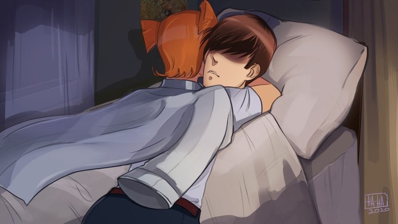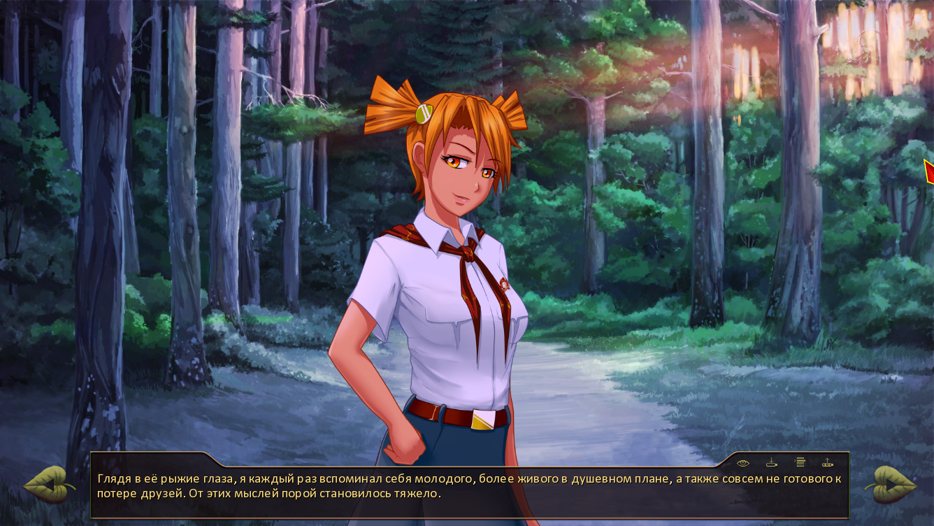 В хорошей концовке Сэмэн так устал и распереживался, что не дошёл до домика, и незаметно сам для себя вырубился прямо на площади, едва присев на скамейку. Он сам уже не понимал, где находится, ему мерещился то домик вожатой, то его однушка. Леночка разумеется была тут как тут, пристроила голову Сёмы к себе на колени, и для пущей уверенности, что он уже никуда не денется, закосплеила Алису: сняла галстук, обвязав его вокруг руки и расстегнула рубашку, чтоб Сёма наконец увидел, какие охуенные у неё буфера. Видимо это и спровоцировало у Semenа эротический сон с участием Лены.