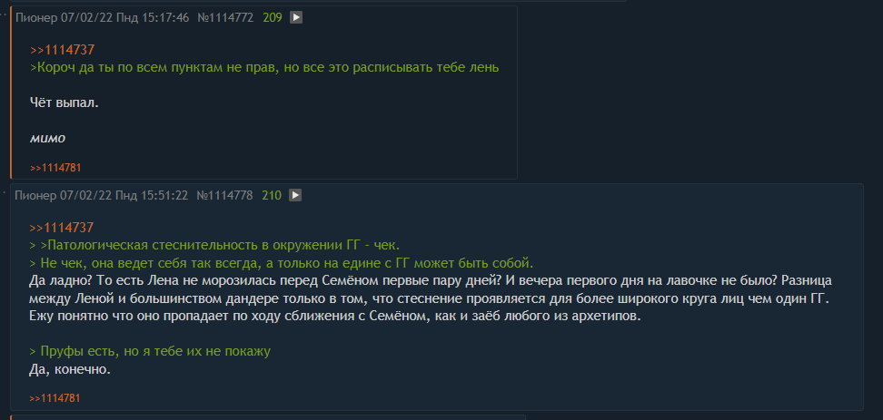 >>1114737 > >Патологическая стеснительность в окружении ГГ - чек. > Не чек, она ведет себя так всегда, а только на едине с ГГ может быть собой. Да ладно? То есть Лена не морозилась перед Семёном первые пару дней? И вечера первого дня на лавочке не было? Разница между Леной и большинством дандере только в том, что стеснение проявляется для более широкого круга лиц чем один ГГ. Ежу понятно что оно пропадает по ходу сближения с Семёном, как и заёб любого из архетипов.