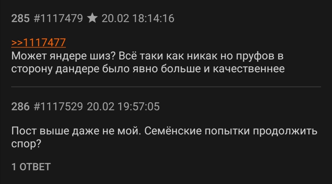 Давайте не будем срачи разводить. Там, сверху, были яндере-дандере шизы, так что, их хватит с головой. Про вайфусрачи тоже самое, каждый выбрал свою, и не нужно оскорблять их выбор.
