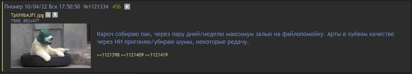 Оператор тредов им. фертильной Леночки, я всё ещё надеюсь до тебя достучаться! Скажи, нет ли возможности у тебя собрание картинок своих передать к нам, в общественное пользование? Вероятно, громаду такую занятных карточек многие и для собственного удовольствия, и для радости подвернувшегося анона захотят приобрести...