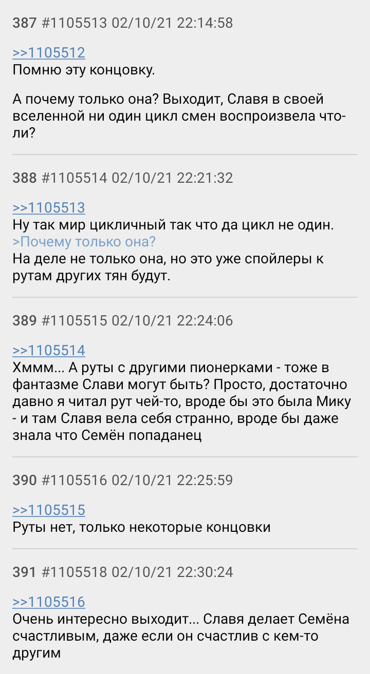 > на основе своих желаний/решений в Нулевом мире(лагерь с пионерками) он попадает в такой мир, Но ведь мир по желанию спавнит поредж, разве нет? > занимает место своей копии Я как понимаю, на старте игры тушка Семёна всё таки умирает, но в РФ-концовках сознание, проведя неделю в Нулевом, врывается вообще в какую-то третью реальность и убивает личность местного Семёна, так оно работает?