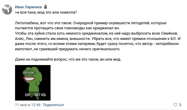 Катюха поднимала тему идеализированности Сливи на стриме, но ведь по факту Сливя же намного ебанутее той же Мику, Ульки и Алисы. Посудите сами. Сливя боролась за всеобщее счастье и радость всем. Итоги: 1)Лена вскрылась/сдохла/ушла в фантазмы/эскапизм, итд зависит от рута 2)Алиса её возненавидела 3)конфликт с Семёном под конец сл-кл, чистая ненависть со стороны Локи в Сл-7дл 4)собака сдохла Абсолютно все близкие живые существа так или иначе либо страдают от её действий, либо им в лучшем случае похуй. О чём это говорит? Манямирок Слави крайне неэффективен, а иногла даже вреден. Ну и где тут идеал. Амбалы конечно ей прописали хэппиэнд с Красивым Стасом, но это по причине прост)))0 то есть детали их взаимоотношений не показаны. ИРЛ такой Стас скорее всего обошёл бы такую тян стороной т.к "надо соответствовать". А если бы не обошёл, то бросил бы после n лет в отношениях т.к сложно вывезти такого человека. Амбалы, Катя, в чём я неправ? Вот вы бы сами ирл потянули бы отношения с тян уровня пивоСлави? Идеализированный образ это Мика и Улька. У этих реально нет весомых недостатков.