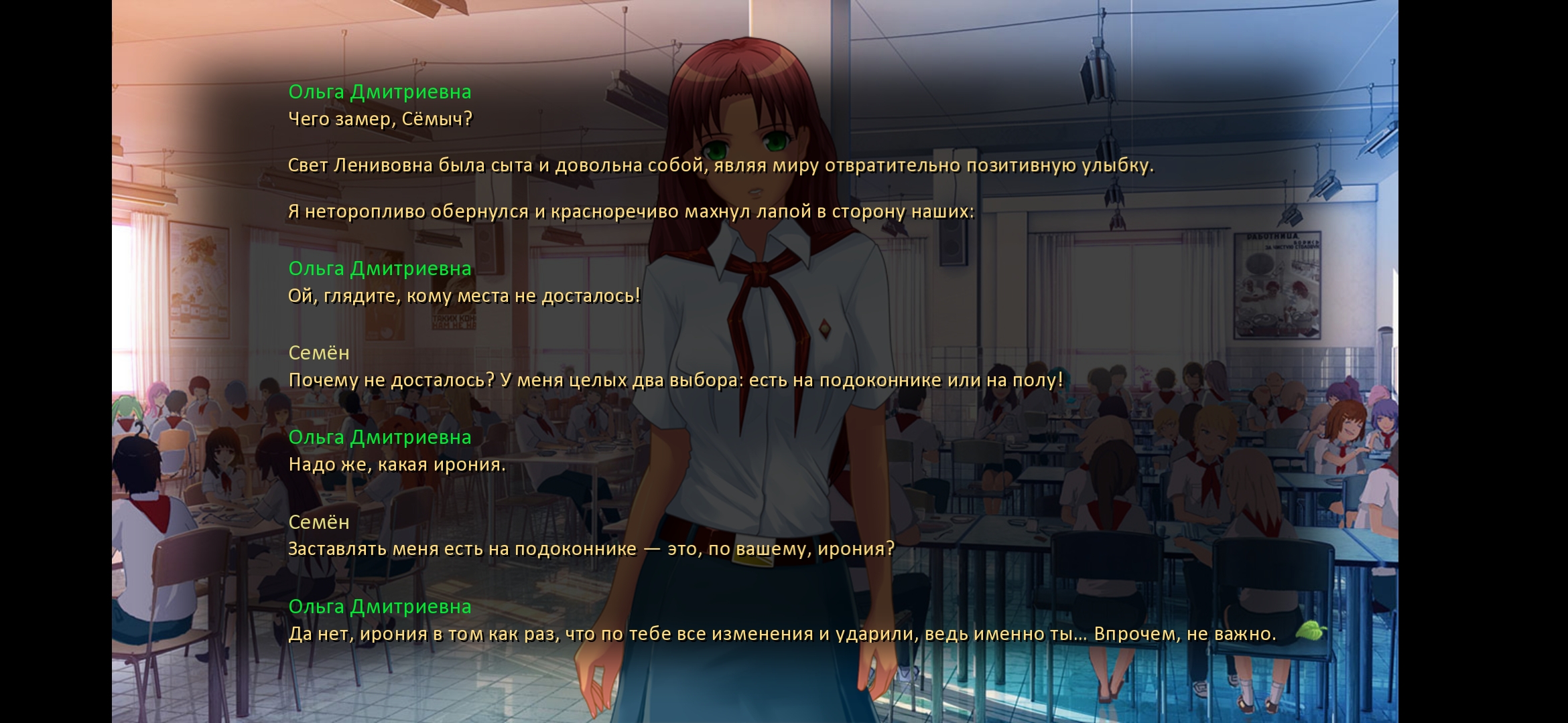 Вот стартанул я новое прохождение за Локи, пошёл куда глаза глядит, а глаза по ходу глядят в разные стороны и кажется даже с разных голов. В первом же дне какого-то хуя в симпатии Лене признался на лавочке, не повзаимодействовав с ней ни разу до этого, ни после, лол. Записался в музыкальный кружок, но при нескольких попытках туда сходить в дальнейшем Семён завыёбывался и так никуда и не пошёл. По просьбе Мику пошёл на танцы, пообжимавшись по пути с ней в кладовке, а на танцах текст как будто и не в курсе произошедшего и мы вроде как случайно вообще там встретились. Вышел в итоге на рут одиночки - ОД без лишних вопросов сожгла к хуям паспорт Семёна, отметив его реальный возраст, а тот блядь стоит будто так и надо и все карты давно вскрыты. И вот всё прохождение состоит из такой хуеты.