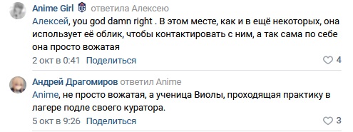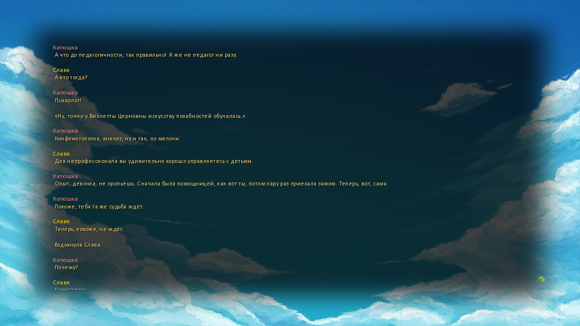 Сап люди, после перерыва решил перечитать 7дл, начал как обычно, со слави, любимая девочка лета. И наткнулся на вот такой диалог с Ольгой, где она говорит "... Как раз, что все изменения по тебе и ударили, ведь именно ты... Впрочем, неважно". Такой фразы не помню, либо забыл, что она имела ввиду? Читаю не первый рут, открыты все пазлы кроме ОД и Ульяны, т.к. Не интересно их читать. В сюжете немного шарю, но не понимаю, к чему она оговорилась? Это она вспомнила других переселенцев или самого мажора?