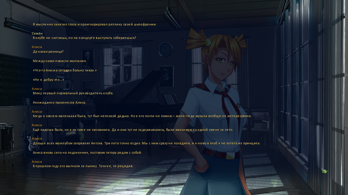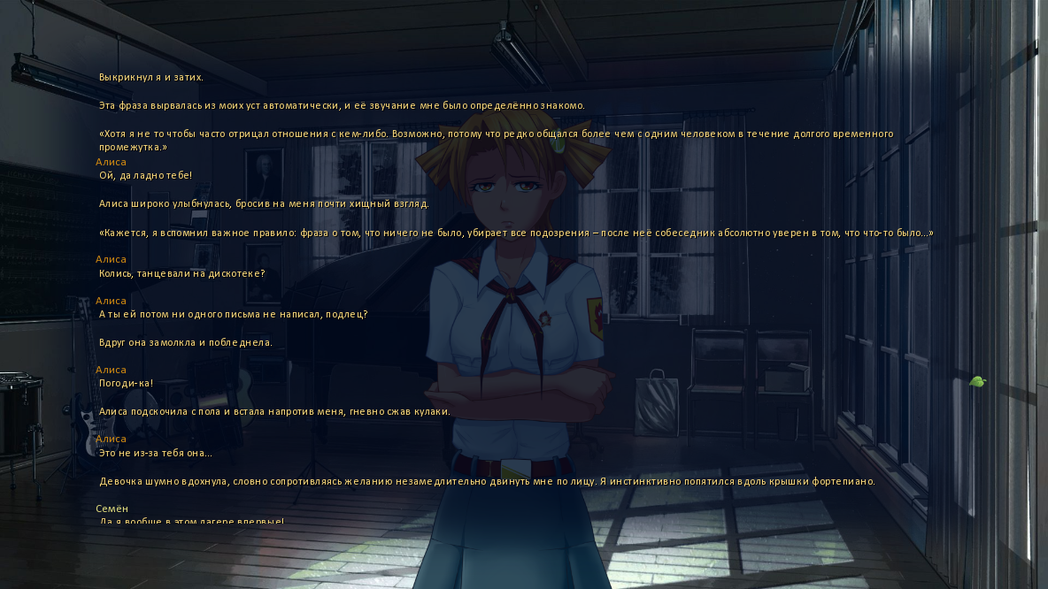 Амбалы, а вы выпилите из Сливи-7дл-Дрища вот этот пиздец? Алисе нет никакого резона краситься в чёрный именно в этой конкретной ветке из хуйлиарда развилок пива, да и у её базового рыжего спрайта волос явно не хватит на понитейл. + откуда она краску то взяла? Возможно спрайт или ЦГ с брюнеткой-Алисой с длинными волосами смотрелся бы нормально в каком-нибудь эпилоге или флешбеке, но тут посреди лагерной смены это тупо шизовая хотелка Абрикоса.
