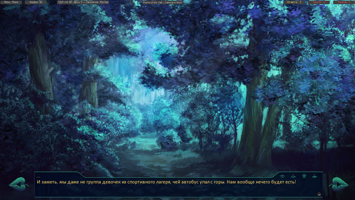 В дневном ивенте с Женей по-хорошему надо ставить разные флаги на разные исходы ивента, а не общее alt_day5_me_neu_nwsppr = True Потому что идя по ветке ответов мы с ней ссоримся и вместо похода на склад она нас выгоняет. А потом если сбежать с костра на "обычный" вечер с картой, то в ивенте с библиотекой Локи вспоминает, что они с ней книги на склад относили.