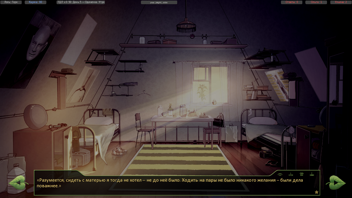 Раздел «Одиночка» переименован в «Семён» Рут Ульяна-Огоньки вернулся в состав рута Ульяна-7дл. Фактически игровой процесс при этом не изменился В ачивлисте достижения в разделе «Прочие» теперь изначально скрытые (до момента их получения) Добавлены спрайты Семёна/Арсения к некоторым разделам/концовкам Исправлены ошибки в описании и требованиях для выхода на концовки