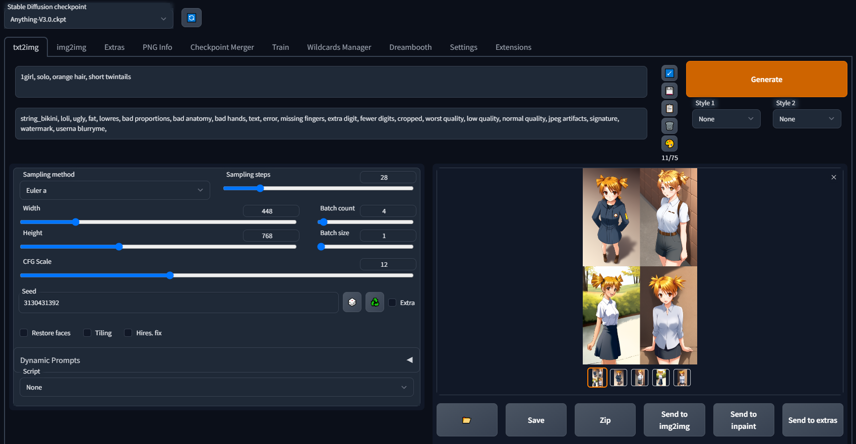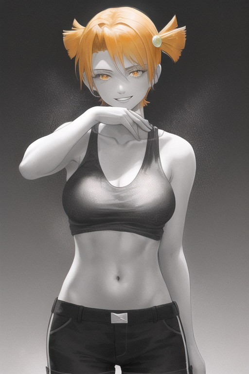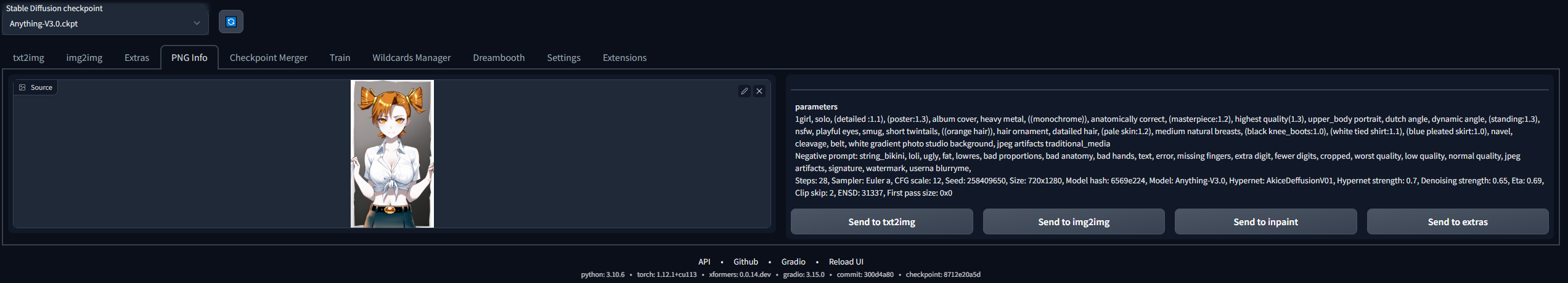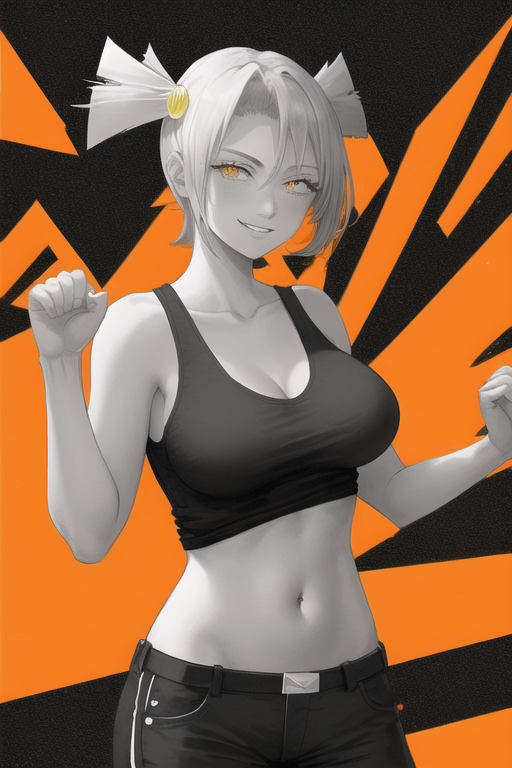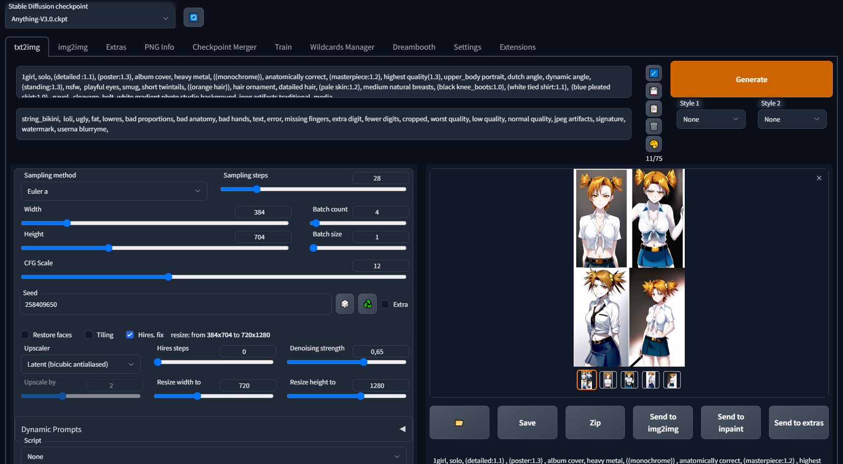 Пример промта для картинок на пике 1: 1girl, solo, (detailed :1.1), (poster:1.3), album cover, heavy metal, ((monochrome)), anatomically correct, (masterpiece:1.2), highest quality(1.3), upper_body portrait, dutch angle, dynamic angle, (standing:1.3), nsfw, playful eyes, smug, short twintails, ((orange hair)), hair ornament, datailed hair, (pale skin:1.2), medium natural breasts, (black knee_boots:1.0), (white tied shirt:1.1), (blue pleated skirt:1.0), navel, cleavage, belt, white gradient photo studio background, jpeg artifacts traditional_media Negative prompt: string_bikini, loli, ugly, fat, lowres, bad proportions, bad anatomy, bad hands, text, error, missing fingers, extra digit, fewer digits, cropped, worst quality, low quality, normal quality, jpeg artifacts, signature, watermark, userna blurryme, Steps: 28, Sampler: Euler a, CFG scale: 12, Seed: 258409650, Size: 720x1280, Model hash: 6569e224, Model: Anything-V3.0, Hypernet: AkiceDeffusionV01, Hypernet strength: 0.7, Denoising strength: 0.65, Eta: 0.69, Clip skip: 2, ENSD: 31337, First pass size: 0x0