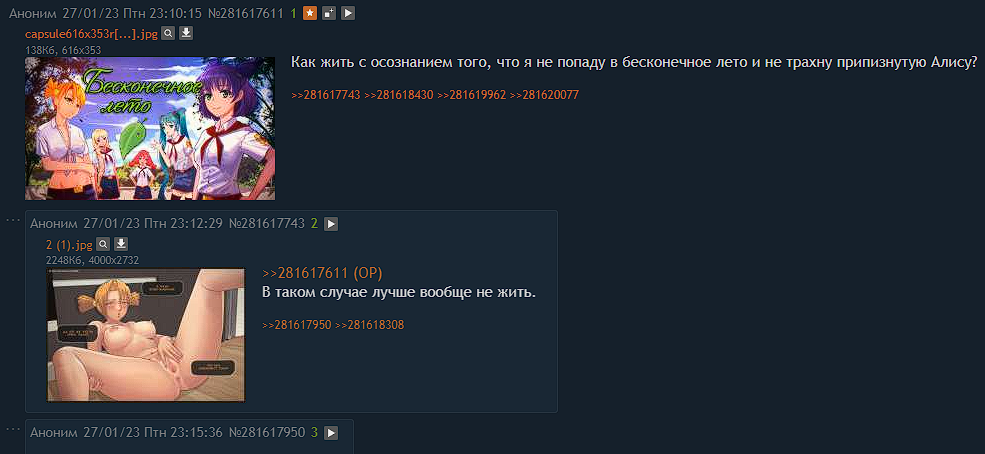 >>1151300 > Меняешь свои мании как носки?) Нехорошо, товарищ) Это было смутное время начала моего пути в познании глубины и дна бесконечного лета. Я был мал и глуп и не видал больших залуп > Внешность маскотов осталась, но они сменили амплуа, были наделены своими характерами и вообще не воспринимаются как маскоты. Соглашусь, но: > связь, например, Алисы, например, с Двачем проследить трудно. Фамилия не в счет. Ну Лене и Алисе дали характер под стать аудитории того или иного имиджборда, поскольку их прототипы - главные маскоты этих борд: Лена - ычан (вечно грустит и тихая), Алиса - двач (бля, тут и говорить нечего)))). Про остальных - они преимущественно копируют свои изначальные прототипы: из Слави тян сделали активистку хз почему; Ульяна - целиком и полностью списана со своего маскота, пусть и изначально он был куда более агрессивным; Мику - не маскот, поэтому сделана чисто на усмотрение разрабов; Женя - мицу тян, по сути тоже с маскота списана, ОД - банхаммер тян, типа модер, смотрящий, короче - вожатая; Виола - коллайдер сама, тут хз почему именно этот маскот, как то не интересовался; Шурик и Электроник - ситуация аналогичная Мику. Ну и Семён - это анон на имиджборде, и каждый маскот по своему рад анончику. А Пионер - это опытный юзер имиджбордов, своеобразный дед инсайд, хиккан с депрессией и отсутствием стимула к жизни, вечно сидящий на имиджбордах уже по привычке, а не потому что ему это доставляет удовольствие, и даже типичный тролль. > А хентай из Лета вообще выпилили. Как то пофигу. Да и желающие могут его восстановить, хотя какой смысл? > Семена изначально любят все девочки, так что можно сказать, что он все время трахался по воле случая) > В этом и фишка Совенка. Не обязательно проявлять особую инициативу, тебя и так любят, тебе и так дадут. По этому "бонусу" тоскует огромное количество парней, да и мы с тобой тоже, будем честны, от него бы не отказались. Я думаю моё видение Семёна по аналогии персонажей с маскотами имиджборд сюда прекрасно подойдёт как ответ