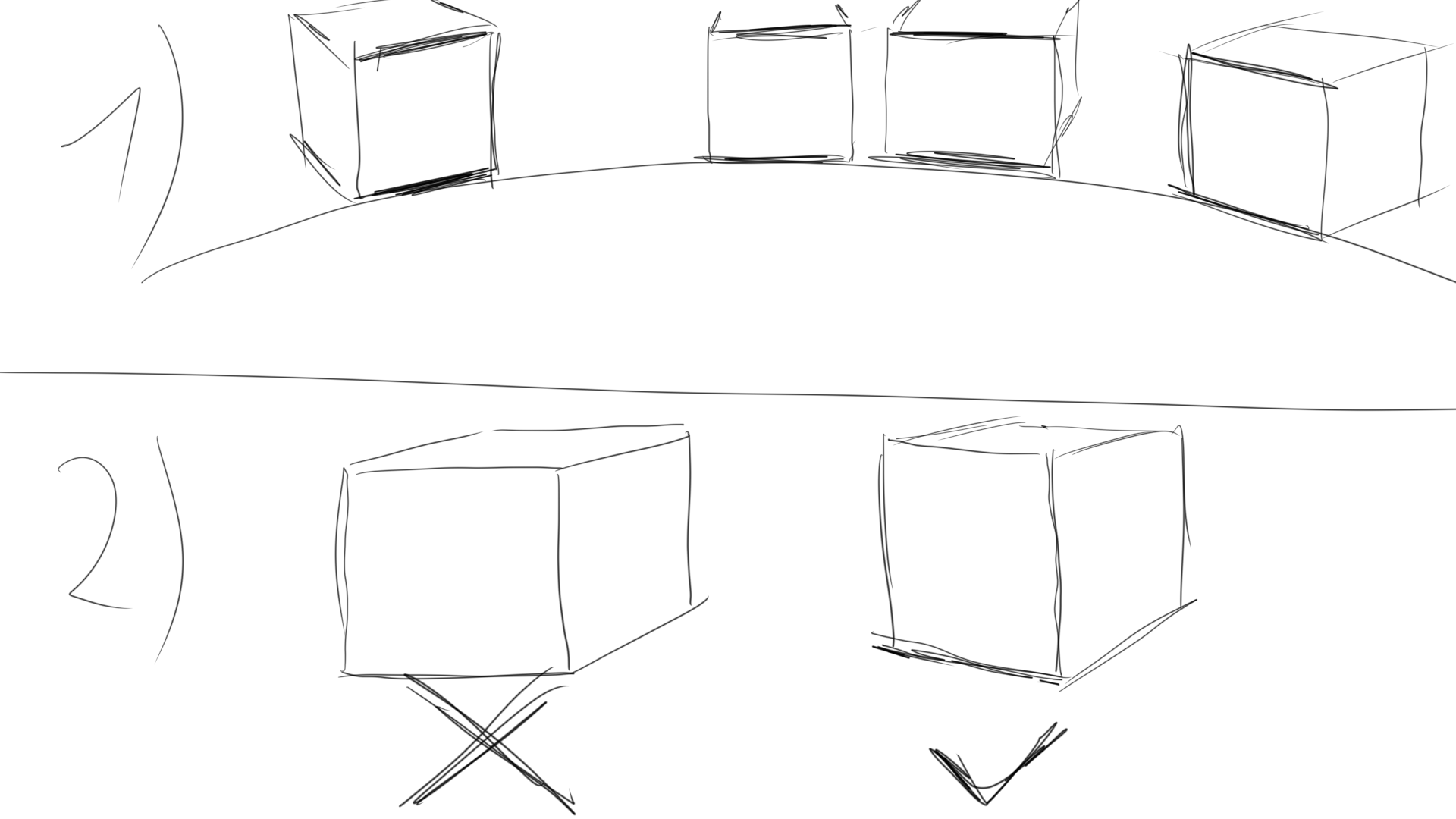 2) Если горизонтальная линия куба прямая, то остальные грани не могут идут на отдаление вот так. .