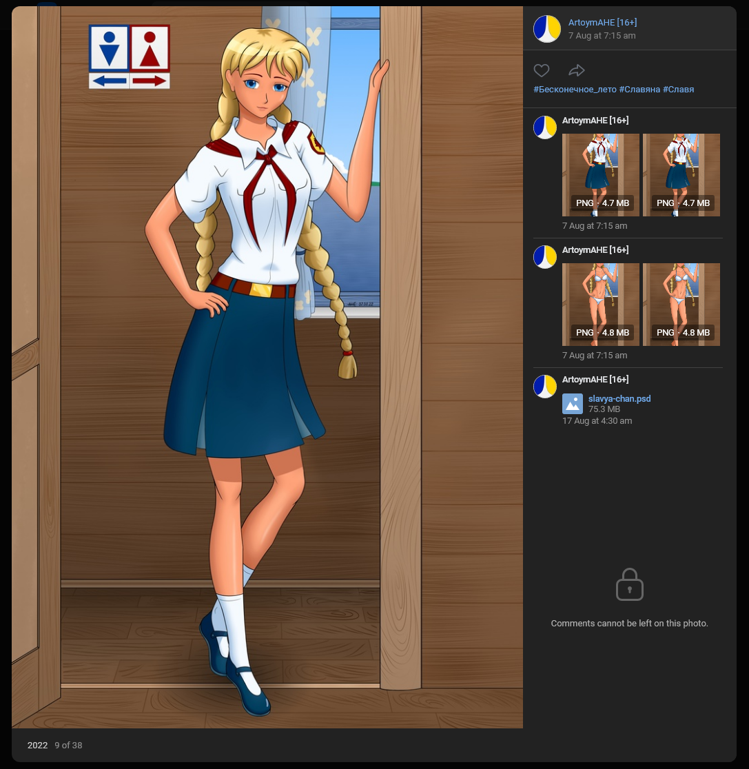 >>1150488 >Он всех рисует голыми. Всех он рисует голыми в домике, в душе, в кладовке спортзала; а форму за гаражами задирает, стринги под мини-юбку (не) надевает, в одной футболке по дорожке гуляет, пионеров нагишом купаться зазывает только Славяна.