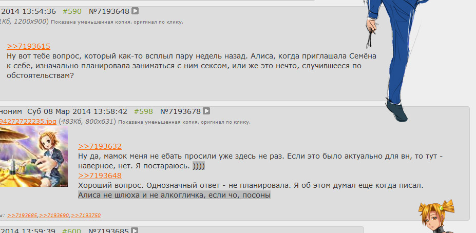 >>1158155 Ну, если сам фик никуда не исчезнет с платформы, то похуй тогда. Пусть лежит, хоть в кастрированном виде, а за фулом если что можно и на зеркало сгонять. Не парься короче. Мы с батей ждем нормальной главы с Алисой и надеемся, что дождемся. Батя рядом кряхтит, задыхается и передает привет.