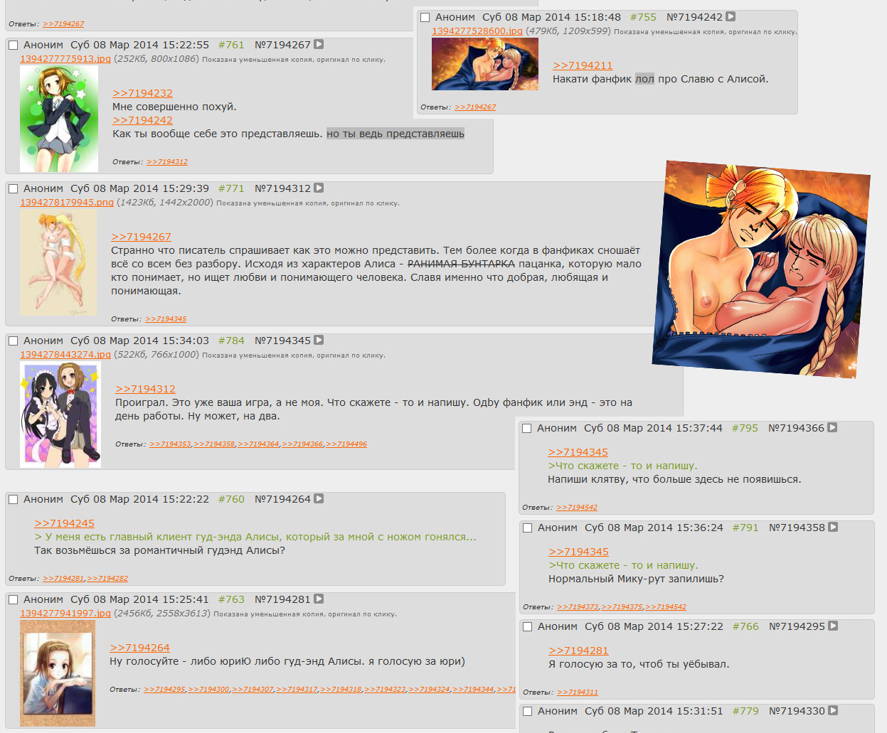 >>1149953 > у нас любая глава превращается в главу про Славю. Может потому что ты – славяфаг? >В 16. Ей продали. Правда. Паспорт подтверждает сексуальную зрелость в том числе. >До этого ей продолговатые предметы были не нужны, а после получения паспорта у неё сразу появился нормальный инструмент для решения подобных проблем. Это Россия 90х такая или альтернативный совок, что пионеркам-отличницам спокойно в 16 лет сексуальные игрушки продают? >Yurt: Обычно - удобный средний или даже меньше среднего размер, легко входит, достаёт все нужные точки, не требует дополнительной смазки, незаметен в свёртке с мылом-мочалкой-полотенцем. Но иногда хочется чего-то из ряда вон. Мсье знает толк в сексуальных игрушках. Чувствуется опыт даже через монитор. > а запланировала пошликать. Разве шлик подразумевает игрушки? >Подумайте, у кого Славя научилась такой открытости, если она о любом важном событии даже вожатой сообщит, что ей далеко не родня, хоть и близкий профессионально человек. OOC такое OOC. >… Артём был идеальным кандидатом. Довольно комплексно для правильной девушки, которая с четырнадцати по сеновалам с мальчишками не бегала. В первой главе она мечтала о муже, который будет любить её по всякому, через N глав дает без обязательств первому попавшемуся пионеру. Ох уж эта логика хентай-фанфиков! Ты либо трусы надень, либо крестик сними. И это всех пионерок касается. Если они правильные, то, несмотря раскрывающуюся сексуальность, не должны давать всем и вся, а только тем, с кем строят отношения и планируют детей. Иначе к чему твоя правильность?