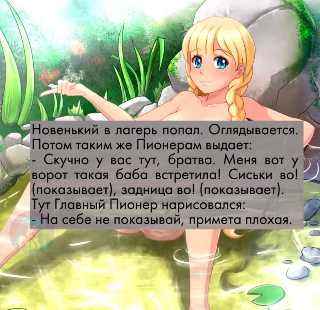 >запасное бельё или средства гигиены Взяла. У неё вполне есть свой комплект, полностью заменяющий лагерный, и дополнительное нижнее бельё, не бойся за её гигиену. Все девочки останутся чистыми. А вообще… >…она давно не отдыхала от нижнего белья, а в лагере — тем более. Славя вспомнила про свои ночные похождения за территорию к озеру, но быстро отбросила их, так как считала их чем-то особенным, требующим нарушения правил для выполнения. Тут же это было совсем не обязательно, и, тем не менее, она понимала, что никто не будет проверять наличие у неё под юбкой трусов. Пока контекст позволяет, она и позволяет себе не носить нижнее бельё. Особенно, если идёт в душ и ничего у неё не запылится там.