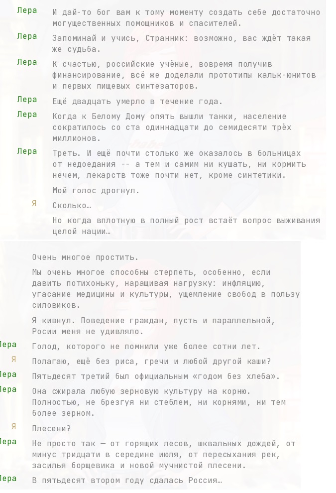 lr "Самым главным и самым паскудным изобретением человечества были микро-ядерные заряды." me "По причине?" lr "Общественное мнение и финансовые санкции. Если ты с кем-то воюешь — это твоё личное дело." lr "Но загаживать общественную планету не смей. Америка однажды жахнула по Тверской области — заработала триллион штрафа." me "Стоп. По той области, которая ни с того, ни с сего увеличилась в десять раз?" lr "Как я понимаю, там сработало свёрнутое пространство, которое среагировало на бомбу." lr "Икарьев Геннадий был жертвой войны — на момент. когда он пошёл во второй класс в своём родном Моос Фестнунг, какие-то умы решили, что пора бы уже на Федерацию напасть." lr "Заодно и опробовали те самые МЯЗы." lr "Что забавно, создатель прототипа американского МЯЗа был сам выходцем из России, из-за чего в обе стороны через границу летали примерно одни и те же заряды." lr "Их преимущество в том, что обладая всеми достоинствами самой обыкновенной ядерной бомбы, они были лишены её недостатков вроде радиационного загрязнения." lr "На месте взрыва оставалось небольшое радиоактивное пятно с лёгкими изотопами, которые довольно быстро распадались." me "Быстро?" lr "Две недели." lr "Собственно, эти две недели и вошли в историю как Третья Мировая Война — все против всех, у всех есть МЯЗ, но ни у кого нет противодействия." lr "Война загоризонтной артиллерии, как её ещё называли." me "И всё, за две недели расстреляли боезапас и успокоились?" lr "Если бы. Просто через две недели у природы лопнуло терпение, и она ударила в ответ — сначала повышением среднегодовой температуры сразу на семь градусов, затем горящими лесами…" lr "Разумеется, это привело к таянию полярных шапок и повышению среднего уровня океана." lr "А ты не в курсе? Спроси у своей Намики, что это за такая Земля Горьких Слёз к северу от её родного Саппоро." lr "А, ты не можешь, точно. Ахха. А почему?" lr "Разве тебе не велели за ней приглядывать? Почему тогда ты здесь, а она неизвестно где?" me "Там… Долгая история. С котиками, кормушками… Электричеством." show lr laugh casualjacket with diss lr "Ах, котик." "Лера подняла голову к небу и долго, обстоятельно хохотала — почти как человек." lr "Какой же ты… Идиотик. Ты же сам хочешь, чтобы тебя обманывали, да?" lr "Электричество! Ой, умора…" "Меня чужой смех не пугал, но поведение робо-гида, то есть организма насквозь синтетического…" me "Скажи… А тебя никогда не звали Розой?" "Поинтересовался я." show lr normal casualjacket with diss lr "Так, это к делу не относится. Продолжим нашу экскурсию." lr "Так вот, у человечества не было бы и шанса, если бы к моменту начала контрудара природы оно не успело создать свой первый машинный разум." lr "Контрудар природы в истории остался как четвёртая мировая, а вот с машинным разумом всё было сложнее." me "Оцифровка." "Догадался я." me "Технологии тогда вряд ли бы смогли что-то путное сделать." lr "Правильно. Весь «маленький принц» превратился в прототипы будущих Сэмов — они и создали первый полностью синтетический разум со способностью к самовоспроизведению." lr "Тот создал второй, второй создал третий… Помнишь, как в Библии: Иаков родил Исава…" lr "Седьмое поколение Сэмов уже было достаточно гибким и мощным для того, чтобы представить человечеству первый прогноз." lr "На тушение лесов." lr "Политики мямлили что-то про экономическую нецелесообразность, но в Бразилии подняли на вилы правительство, после чего все прочие призадум