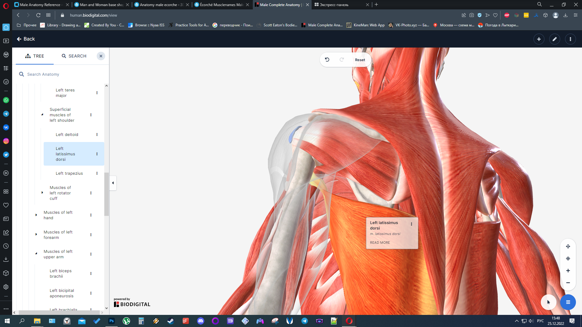 Если что-то заковыристое надо посмотреть, вроде того как широчайшая мышца спины заныривает под лопатку и трицепс, то иду на https://human.biodigital.com. Тут рега и постоянно меняется оформление. В меню Explore выбрать «Complete Anatomy», выбрать пол, и оставить видимым только кости, мышцы и связки. Тормозит, зато можно любую мышцу убрать или сделать прозрачной и разобрать человеческое тело по кусочкам.