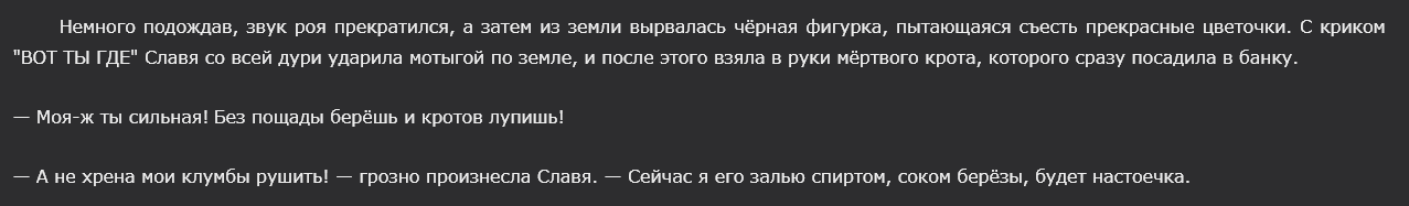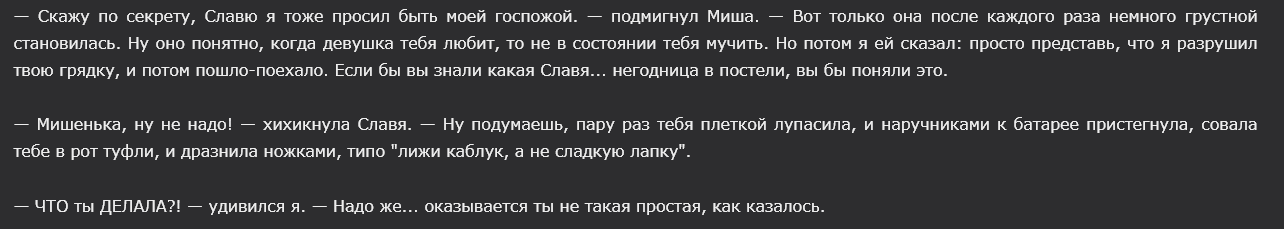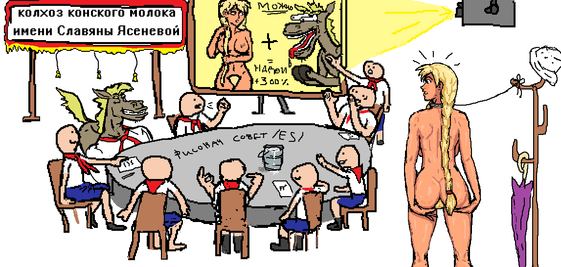 >>1165233 "В момент, когда Буян пронесся рядом со мной, я мельком увидел на его гиганских причиндалах следы помады…" Напомнило, как девушка для коня покупала вазелин. Чтобы его шерсть красиво блестела. Надеюсь, здесь тоже есть простое, но неожиданное объяснение. " — У коня весь низ исцелован." Все еще надеюсь на лучшее. "А самый большой брат постоянно следит за тобой." А рабство это свобода, ага. Концовка главы весьма хороша и достойно повествует о нелегких буднях отечественной объезчицы мустангов. Надеюсь, что в лагере наша рабочая парочка теперь устроит Славе несколько очень трудных ночей. Чтобы проверить, насколько сильны руки дружбы и как глубоко они могут зайти.