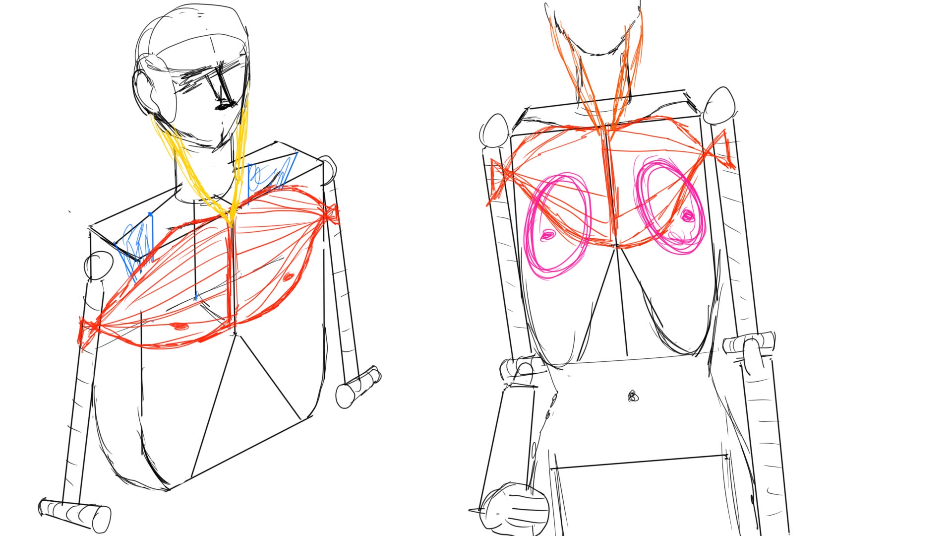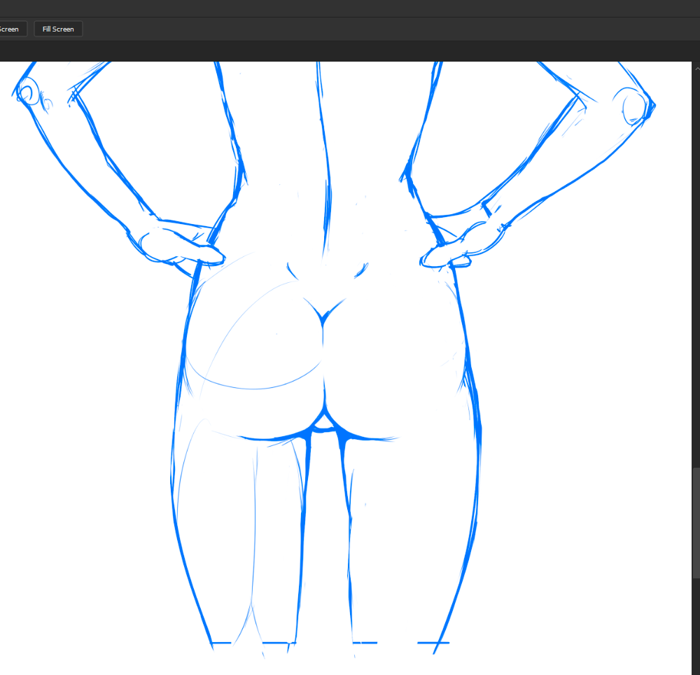 Почти как половины двух разных рисунков, сверху более "реалистично", снизу - идеализованные аниме-бедра. Слишком кругло? большие ягодичные мышцы перестали читаться, ямки или прямой участок между gluteus maximus и gluteus medius пропали.