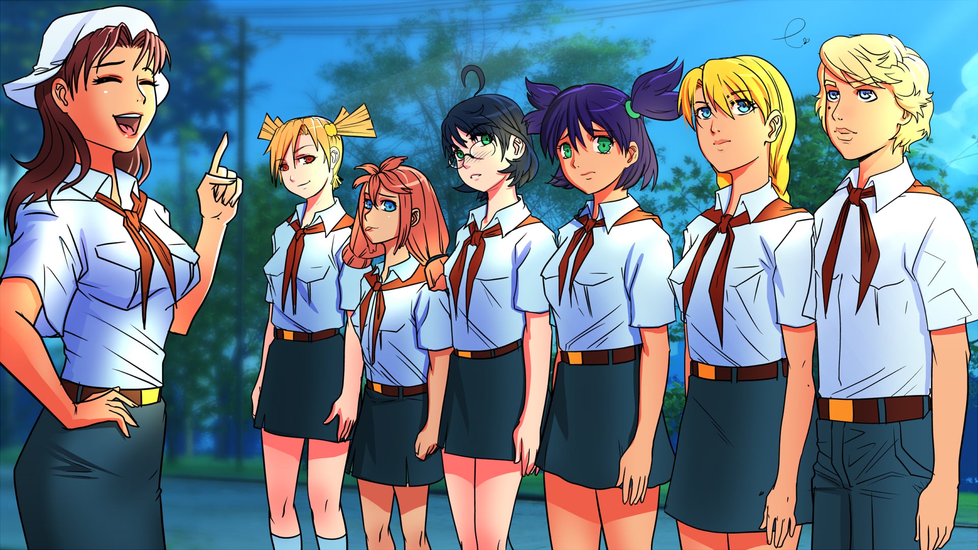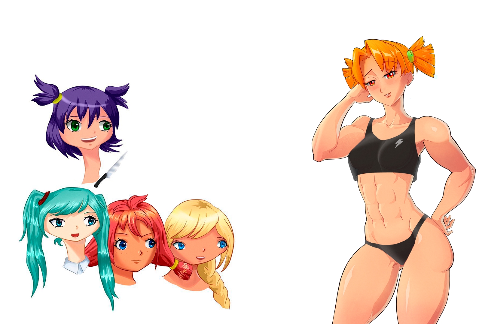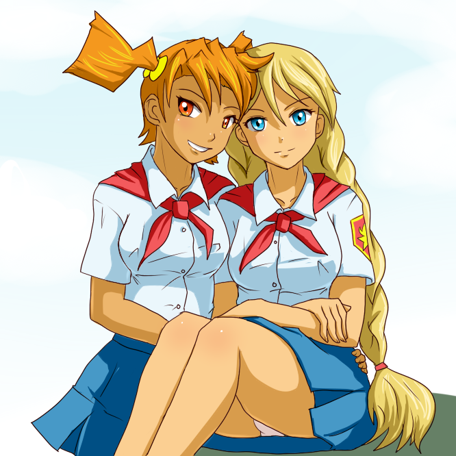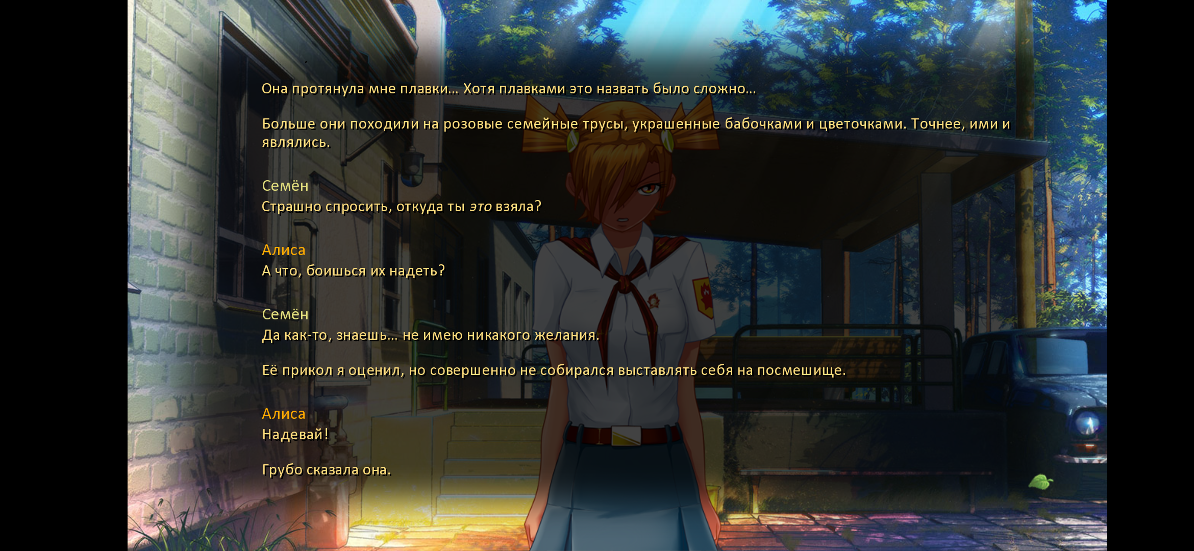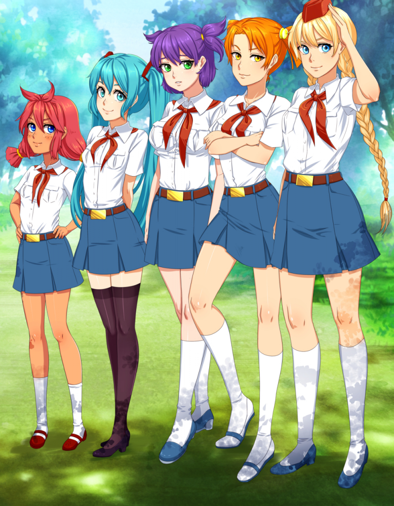 Откуда пошли стереотипы, что Алиса такая вся из себя спортивная? Ничего против не имею, но по канону она на спортсменку никак не тянет. Бег - это к Славе, футбол - к Ульяне, бадминтон - к Лене. Плоский живот у всех. Алиса в основном по лагерю шаталась и на гитарке бренчала.