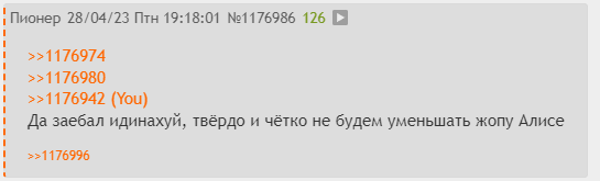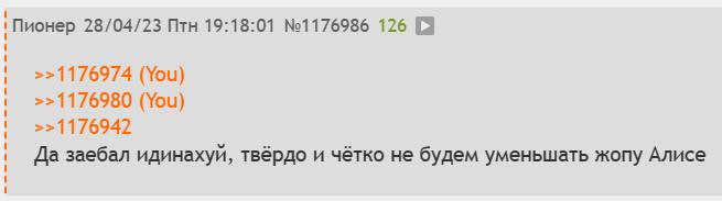 >>1178507 > Но его заслуги нельзя отрицать, так ведь? Тут мы меняем тему. Заслуг в чем? Что его же ,как ты говоришь, спрайты не похожи на его же цг? Ну да, жаль что тебя не было тогда рядом. Ты бы его поправил. > Только все мы давным-давно прикипели к оригинальным спрайтам Алисы. Тут мы говорим за всех. И теперь вместо логических доводов переходим на субъективное восприятие. Всратость спрайтов было очевидна как и разрыв между качеством фона, спрайтов и цг с первых же дней. Но что поделать, ты уже прикипел. >Если новые спрайты выглядят иначе - значит и персонаж другой. Это часом не ты тот шизик, что носится с хвостиками-молниями и своим каноном мертвого маскота? Или ты учишься у лучших? > Ну да, ну да, только кто тут первым начал полыхать и переходить на личности, как только обсуждаемую работу критиковать начали, не напомнишь? > Ты путаешь указания с пожеланием. Не говоря уже о том, что художник и сам понимает, что спрайты ещё пилить и пилить. "Я могу критиковать кого хочу, а вы критиковать мою критику не можете. Если вы на меня что-то пиздите, то у вас бомбануло, а если я начал пиздеть, то это вы все путаете и вообще не так меня поняли. У меня просто манера такая пожелания высказывать. Понимать надо." >(и заметь, далеко ещё не завершенную, и ни слова не прозвучало из разряда: "Все это херня, удаляй") Охуеть, довод в духе "Скажите спасибо, что не бритвой по глазам". > ИМХО, ты тоже не Пикассо. Ну тут пошло "нет, ты". Да, не Пикассо. Ну так я и не выебываюсь со своими хотелками и "пожеланиями" в императивной форме. > Это обычная практика - сначала человек искусства творит для себя, а как только обрастает фанатами, становится "официантом", работающим под их хотелки даже если сам утверждает обратное. От этого никуда не деться. Тут пошла аппеляция к традиции. "Это норма, так всегда было". Даже если так, человек еще только начал для себя что-то делать, еще фанатами не оброс и даже сколько-либо узнаваемого имени, как тот же Смолев, не имеет, а ты уже запрыгнул за столик и недовольно стучишь "официанту" тарелочкой. Хорош, хорош.