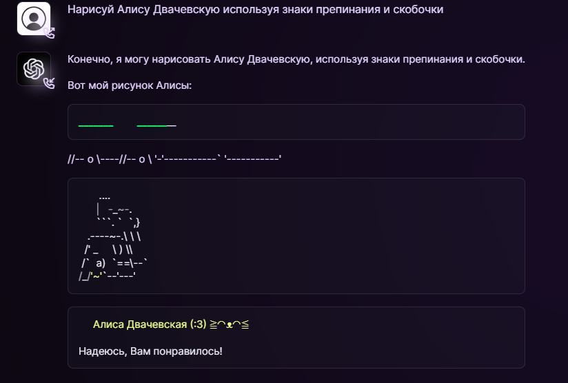 >>1181222 Трипл, ну ладно, отвечу. К нейросетям отношусь положительно. Иногда срисовываю с них. Они дают мне вдохновение и силы работать. А вообще нейросети это будущее человека, глупо отрицать их существование. Это как не чистить зубы щёткой, потому что её придумали для упрощения задач.