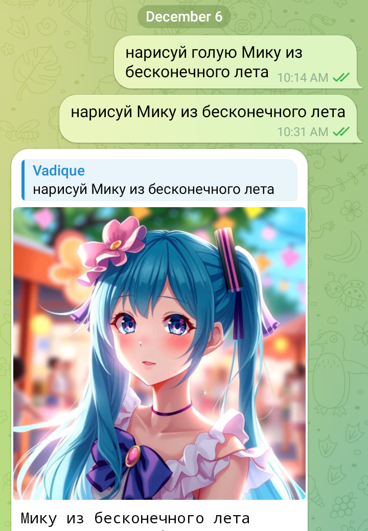 >>1235423 БААКАА Как бы там любители лучшего микурута не пытались подменить понятия - настоящий микуфаг помнит, что Мику в летоньке это персонаж-отсылка. И отсылка это не только имя, а ее поведение, характер и разные забавные ивенты с ней.