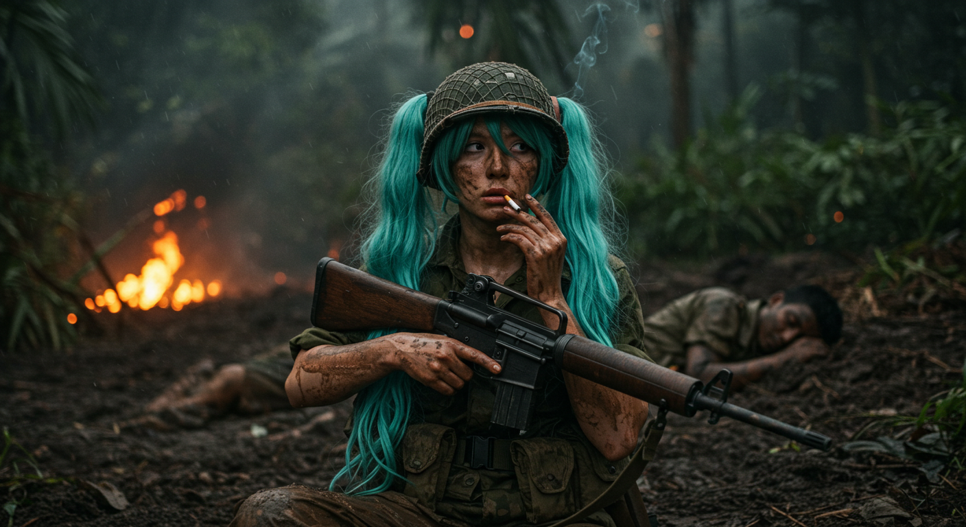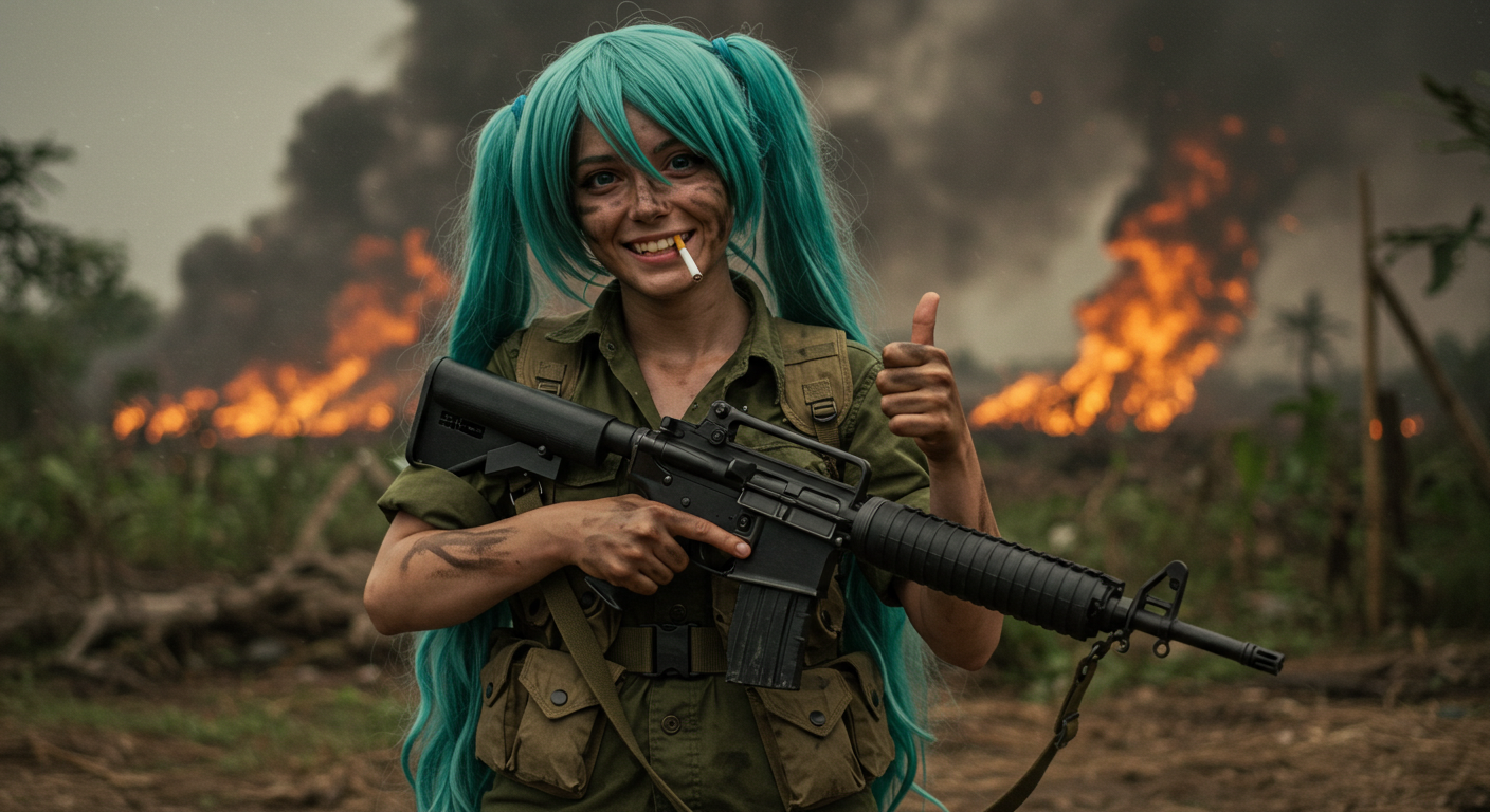 >>1250461 old military photo from archives in color, real person Hatsune Miku, with M16, thumb up, face in mud and soot, smoking cigarette, in aₘₑᵣᵢcaₙ uniform of the ᵥᵢₑₜₙaₘₑₛₑ ʷaʳ, burning jungle in the background, view fram afar В других случаях использовал real photo, old camera photo