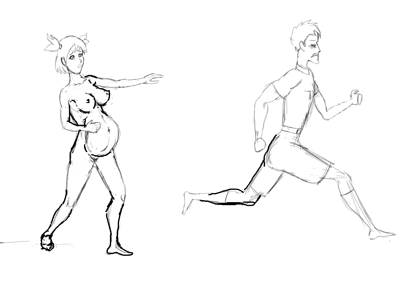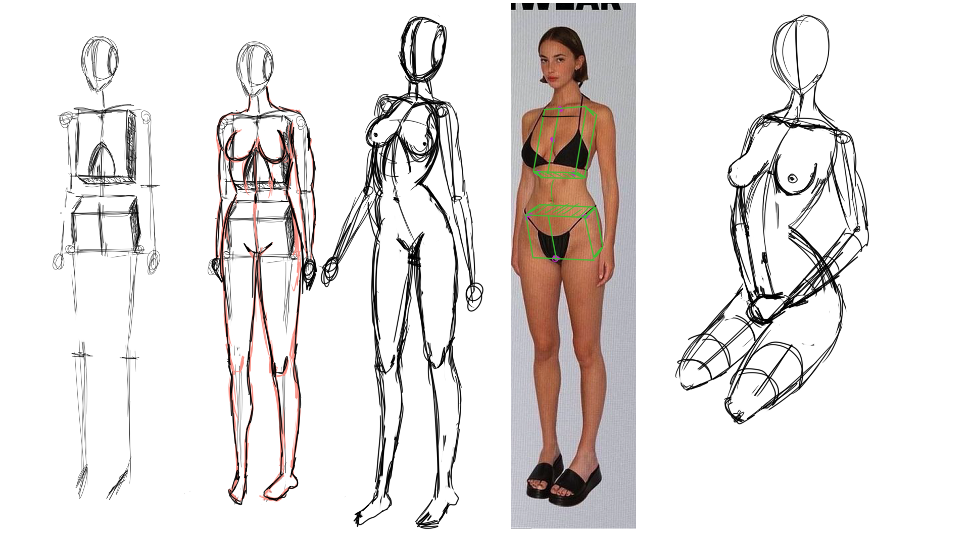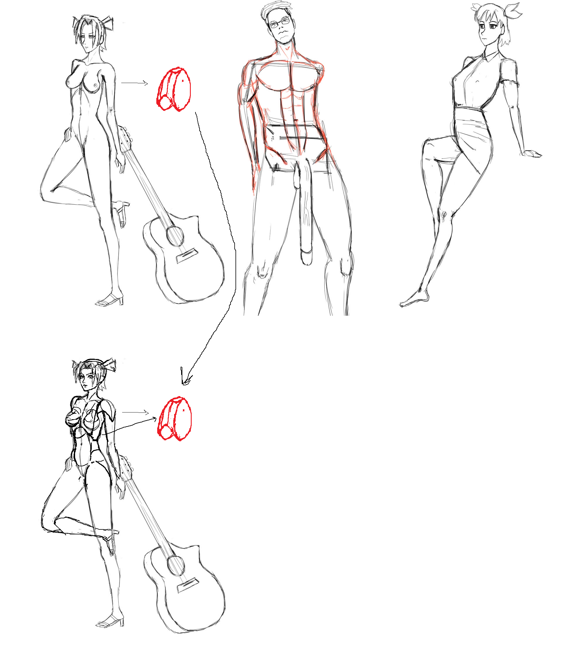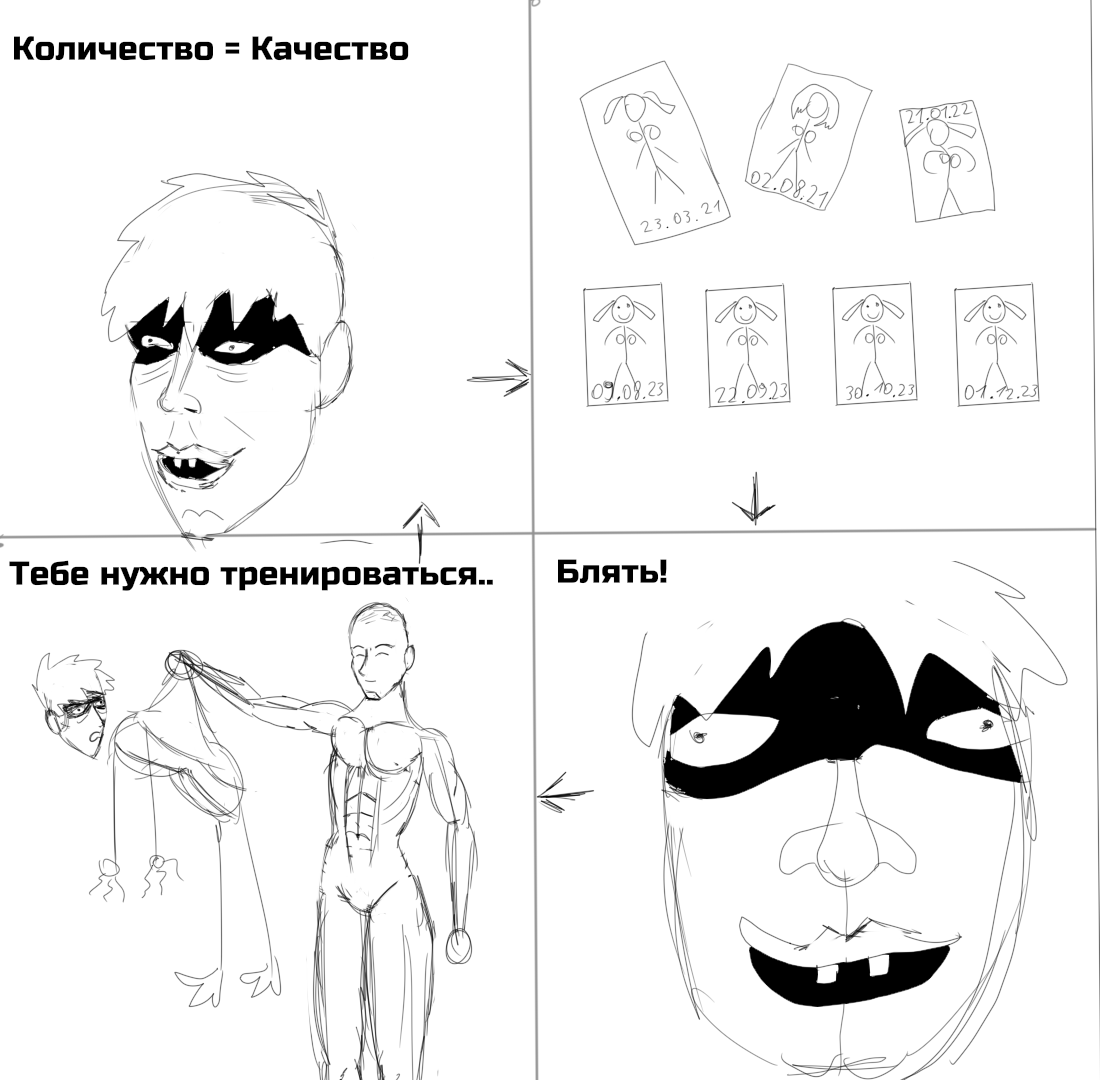 > Я так понимаю, каждое из этих действий это отдельное упражнение и имеет место быть, но меня разрывает от этого. А тут целиком все зависит от твоего желания, что именно ты хочешь подтянуть. Я например сперва набрасываю два круга, для обозначения массы грудной клетки и бёдер, а потом от них пляшу. Ты сам себе ставишь правила. Хочешь рисовать динамические позы, тогда добавляй линию движения и строй все вокруг нее. Я предлагаю начать с простого и работать только с изгибами тела, даже если получатся кривые уроды. Тут важно отработать навык вести линии любой кривизны, а не глазомер развивать.